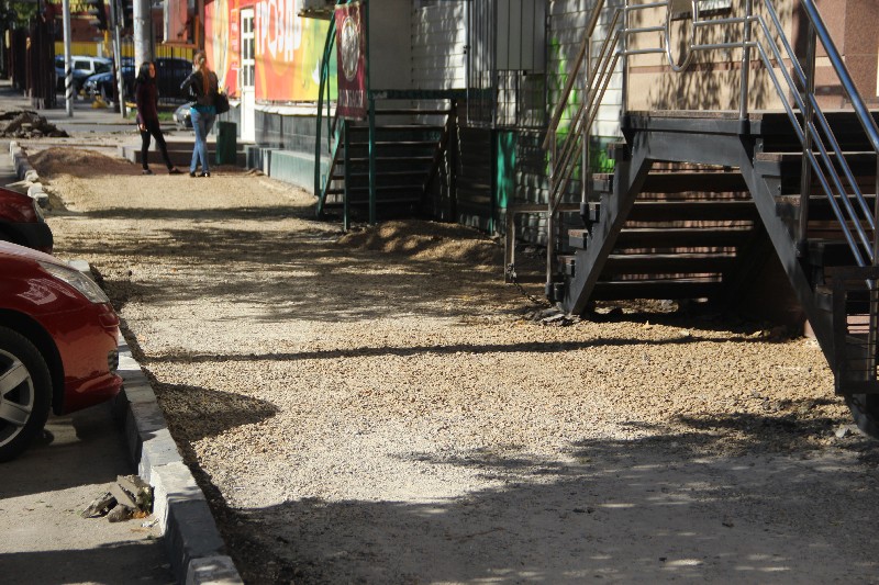 Качественное дорожное покрытие объясняется хорошей подготовкой щебеночного основания, которое укатывали два дня, используя расклинцовку более мелким щебнем для обеспечения ровного и прочного слоя. Кроме того, подрядчик показал дополнительные работы, которые выполнила организация. «Перед началом ремонта была проведена геодезическая съемка, которая показала необходимость организации стока дождевых масс со двора на улицу Офицерскую. Поэтому были проведены дополнительные работы, не предусмотренные контрактом на участке между двором и улицей Охотной» - рассказал Александр Яковлев, гендиректор АО «Трасса», проводящего ремонтные работы.