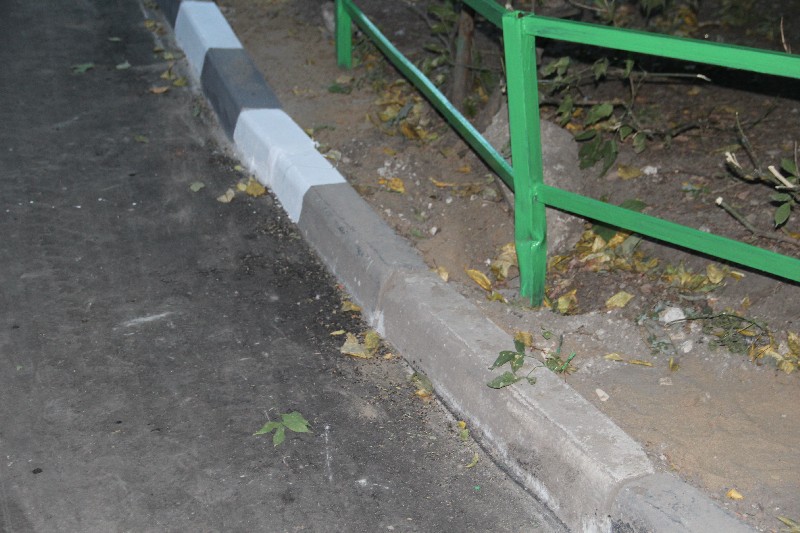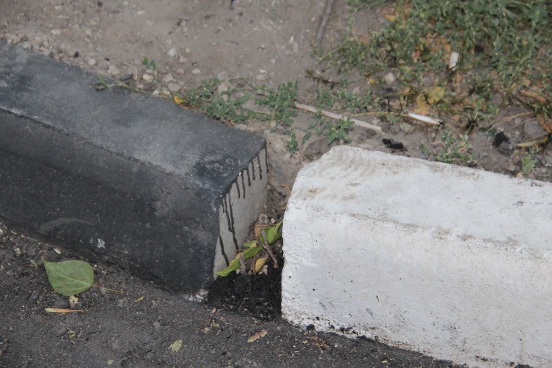На повороте во двор дома № 7 подрядчик использовал несколько старых расколовшихся бордюрных блоков, резко контрастирующих с уложенными новыми.