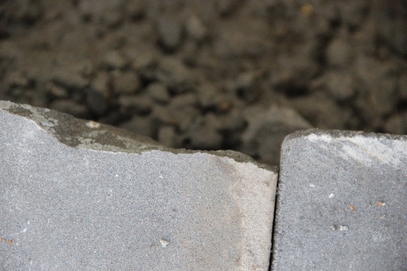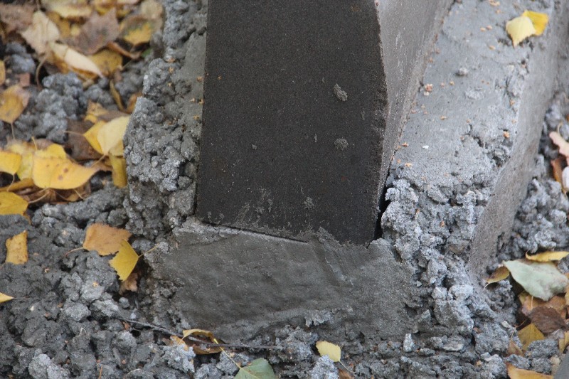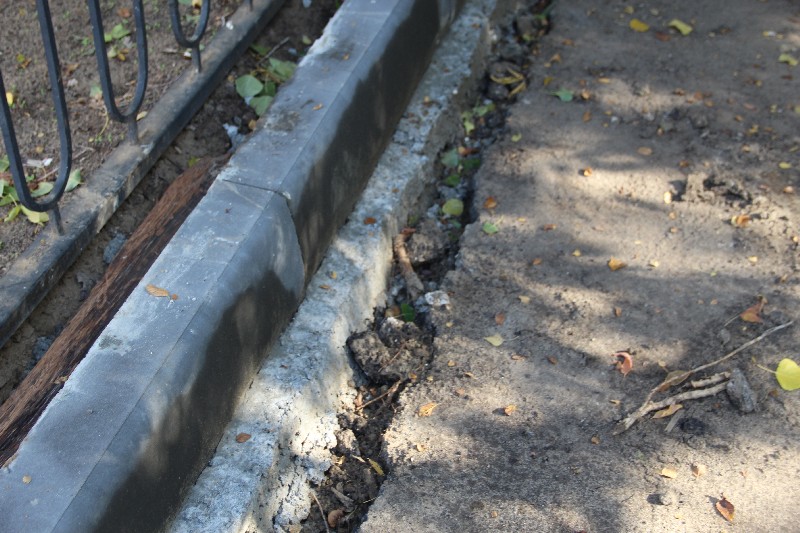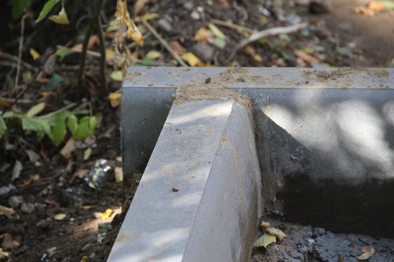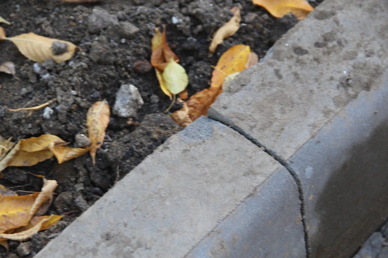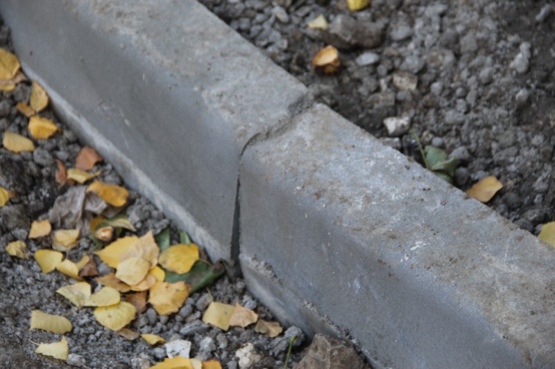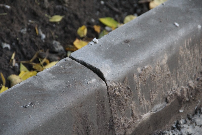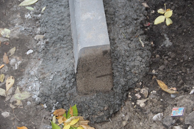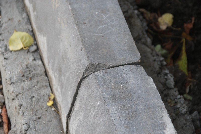 Бортовой камень здесь уложен визуально хуже, чем у «Оптимы», но в целом удовлетворительно, не считая отдельных моментов, которые требуют исправления. Недостатки геометрии бортового камня компенсируются усилиями рабочих, срезающих выступы и не жалеющих цемента на замазывание стыков.