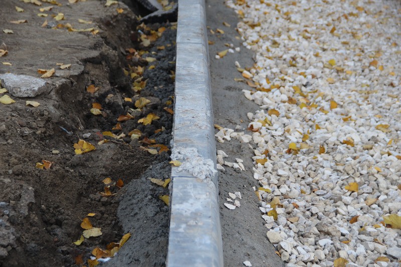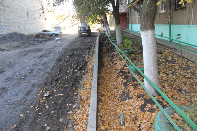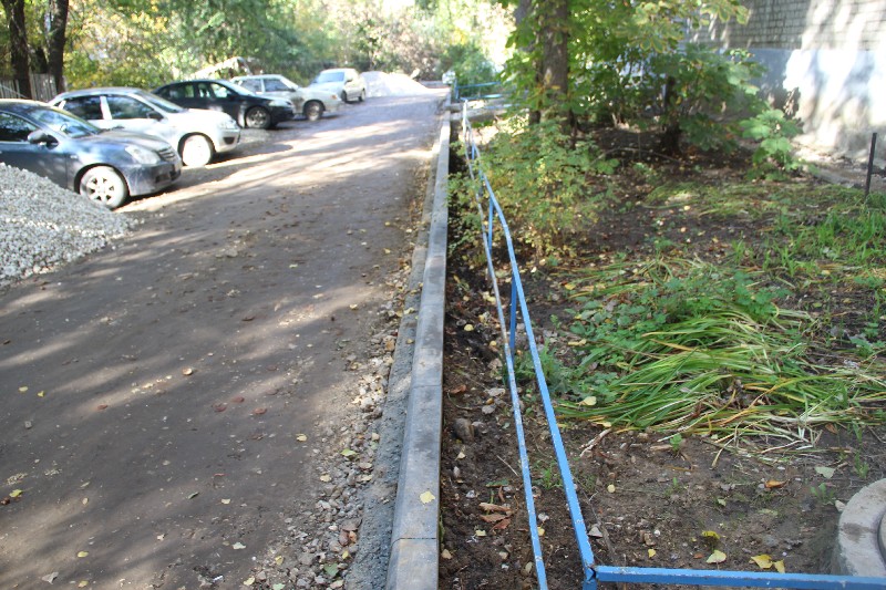 Еще одним объектом посещения стал двор в Ленинском районе на Топольчанской 5, где работы ведет АО «Автогрейд». Пользуясь наступившим бабьем летом, подрядчик активизировался, завершая установку бортового камня и завезя щебень. В отличие от двора на Высокой 18, здесь не смогли определиться, устанавливать бордюр или сохранить дерево. Ситуацию разрешили не вашим — не нашим, и камень не установили и кору повредили.