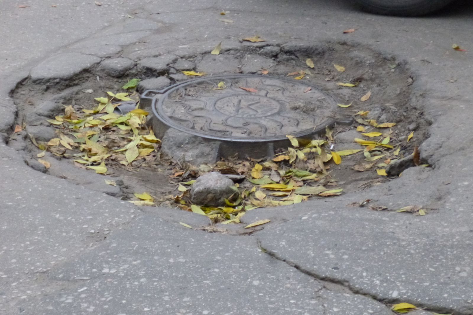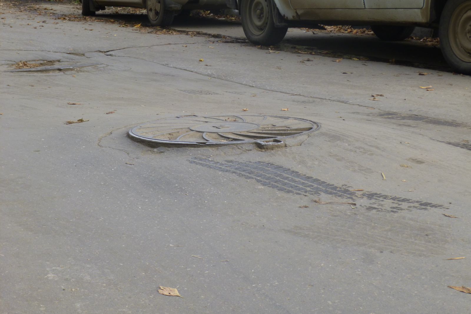 Следующий квартал запомнился ямой в районе 105-го дома. У дома Рахова № 162/164 на проезжей части жмется к парковке малозаметный провалившийся люк. Во время дождя его заливает, и влетевший в него автомобиль может остаться без колес.