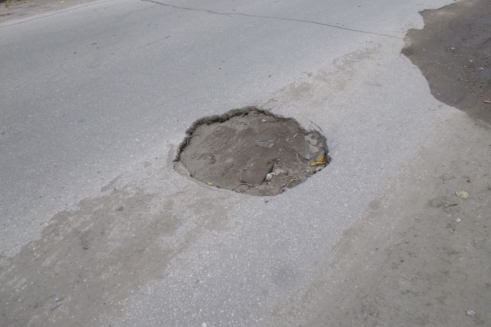 Напротив дома №176 посреди проезжей части образовалась яма, видимо, на месте смотрового колодца, на что намекает форма провала.