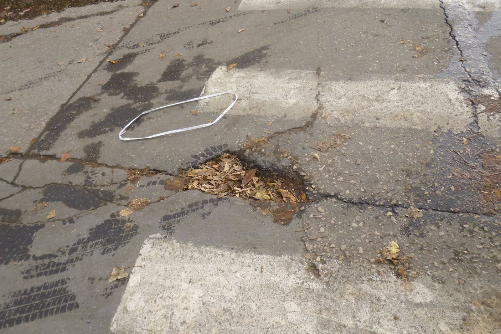 На углу М. Горького/Зарубина внимание «Дорожного контроля» привлекли несколько мест. Первое – яма на пешеходном переходе. Она завалена листьями, будто кто-то решил поохотиться на невнимательных или попросту неосторожных пешеходов. Второе – глубокая яма на проезжей части напротив дома на М. Горького, 62. Возможно, она является следствием провалившегося люка.