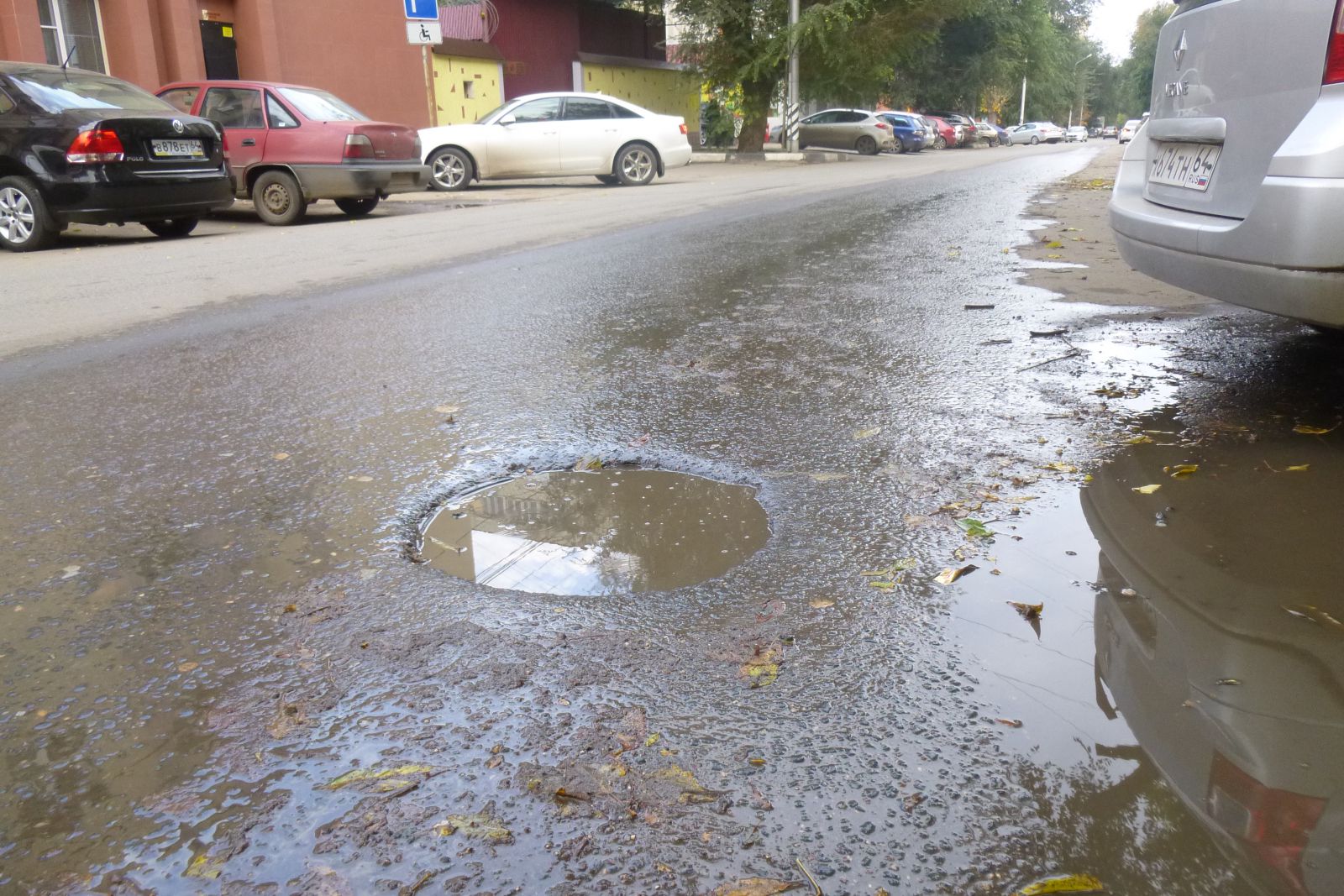 Продвинувшись к дому № 159, «Дорожный контроль» обнаружил большую яму, заполненную водой. На небольшом участке между Пугачева 147/151 и началом дома на Зарубина 158/162 расположился целый букет ям. Своего рода треугольник образовали ямы неподалеку от въезда в ТЦ «Триумф молл».