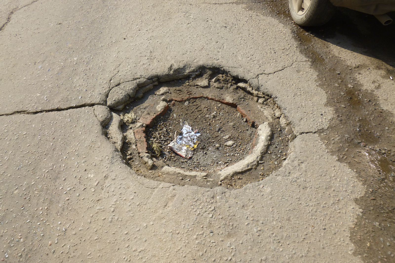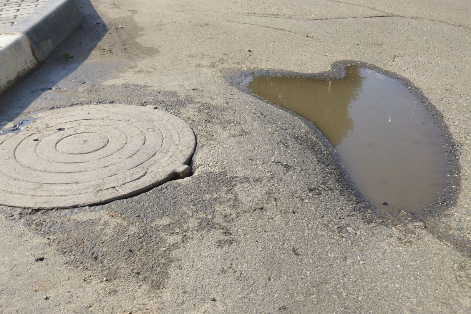 Миновав небоскрёб, мы увидели вскрывшийся смотровой колодец. Автолюбителям приходится неспешно его объезжать.