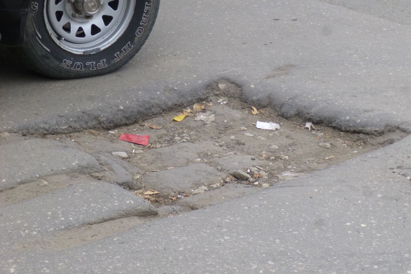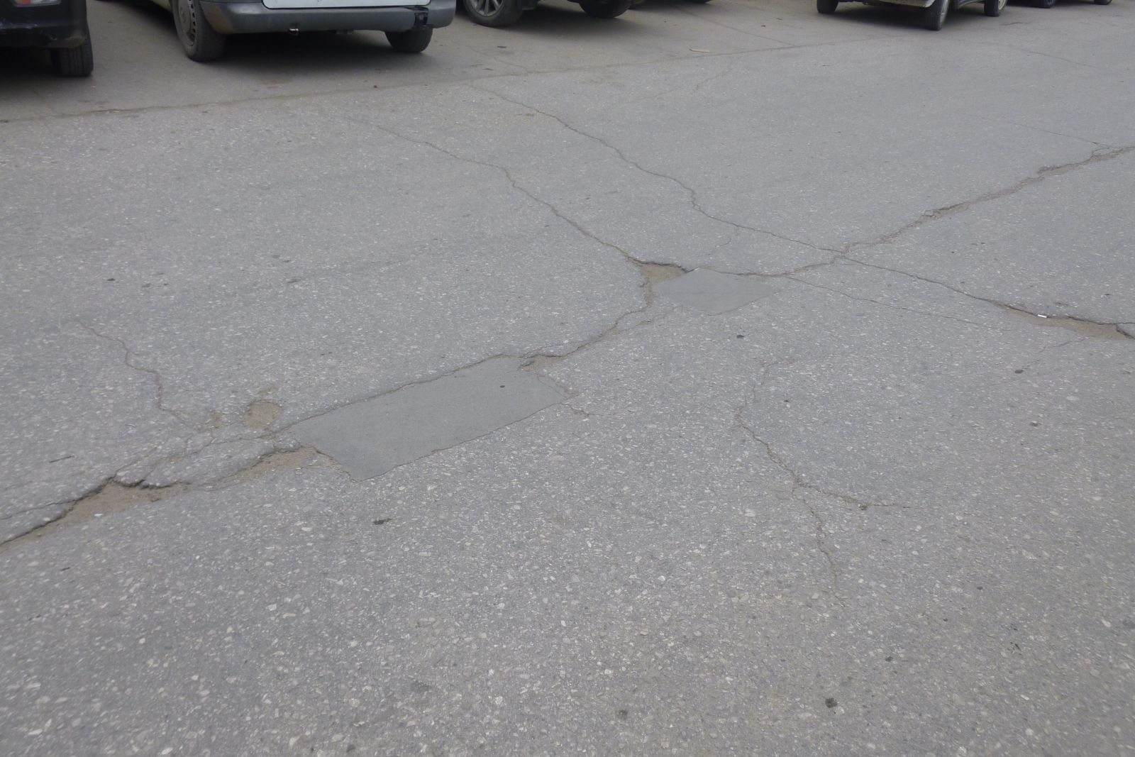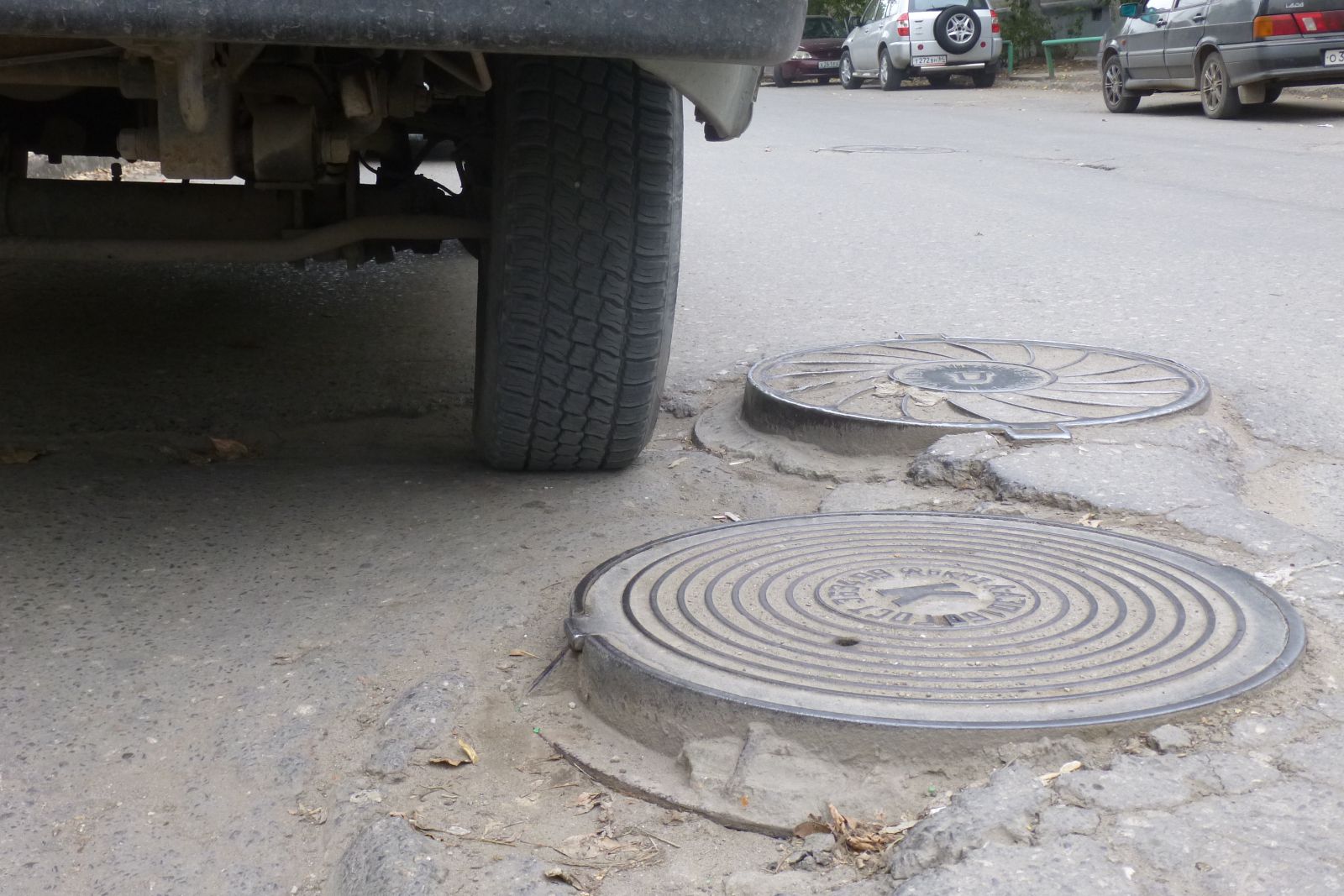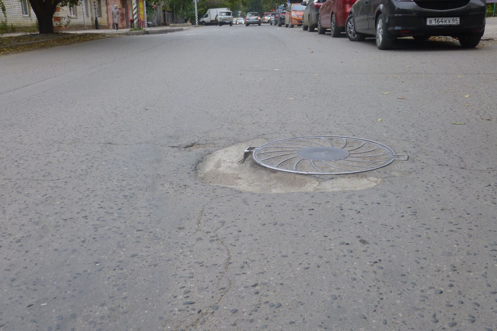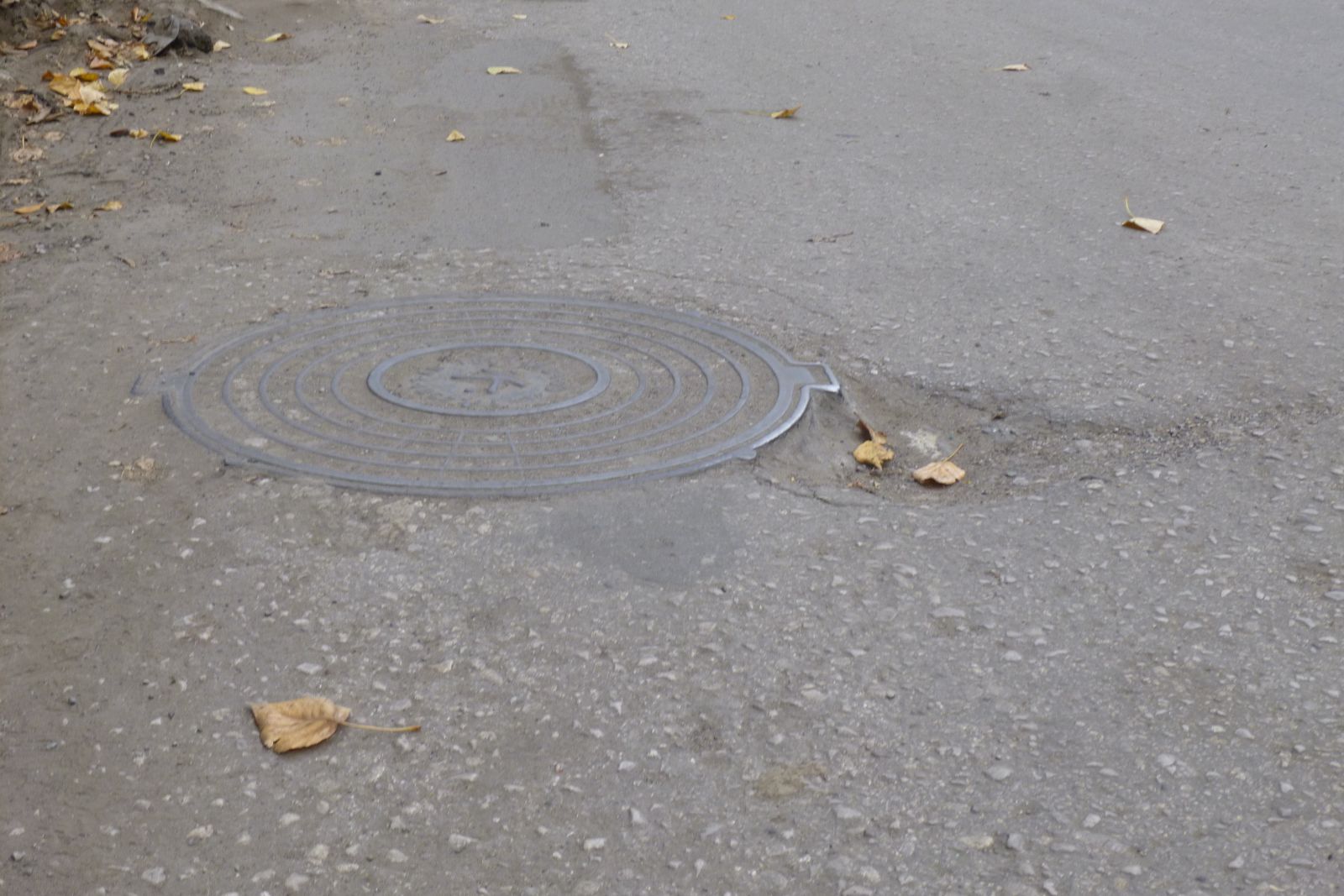 Нельзя оставить без внимания отремонтированный картами участок, испорченный многочисленными уже надоевшими выбоинами, просадками, в результате которых границы смотровых колодцев вокруг люков разрушены. Из-за этого центральный люк начал возвышаться над всем перечисленным безобразием.