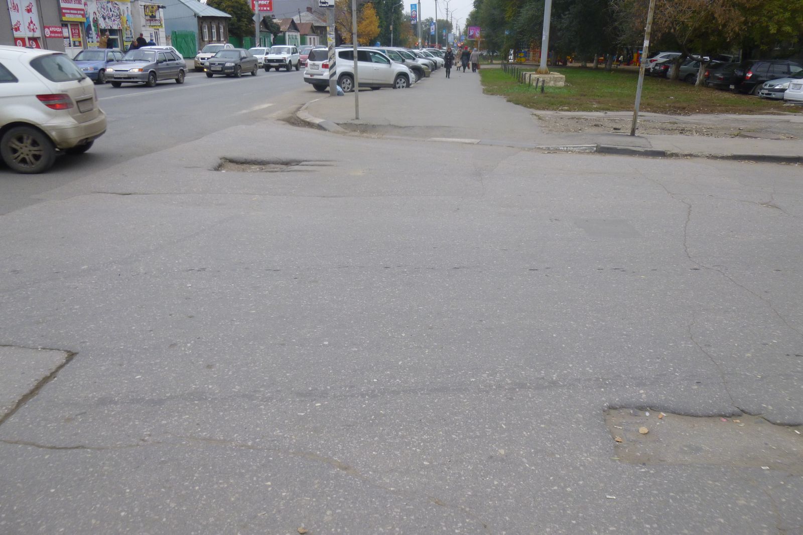На пешеходном переходе уже с другой стороны вышеупомянутого перекрестка ситуация несколько лучше, разница лишь в том, что на смену выбоинам пришли две ямы у дома №147/151, а на смену люку с оголившимся боком – люк у торца ТЦ «Ваш Дом», возвышающийся над асфальтом более чем на установленные ГОСТом 2 см.