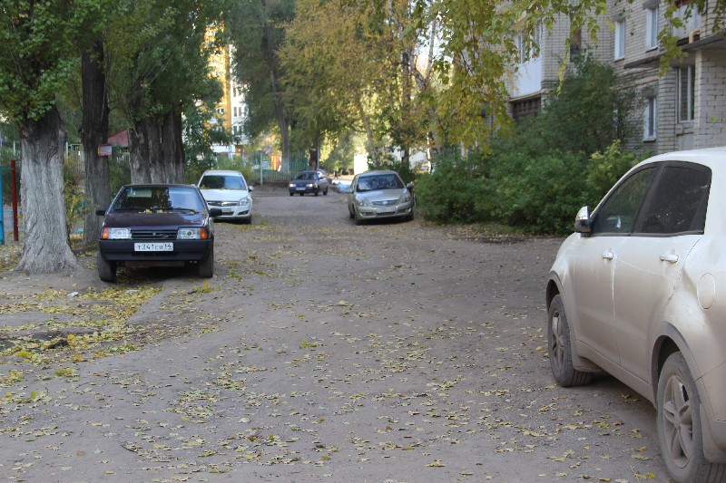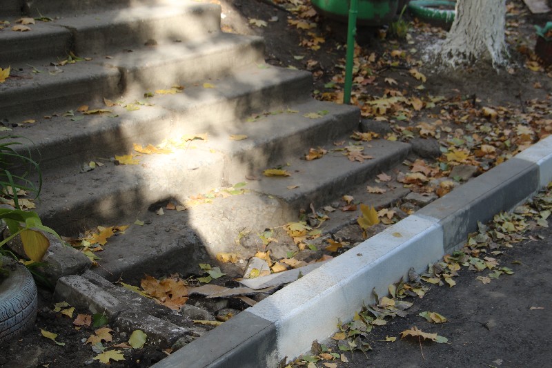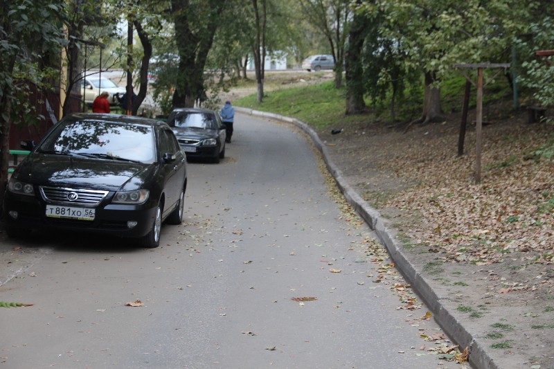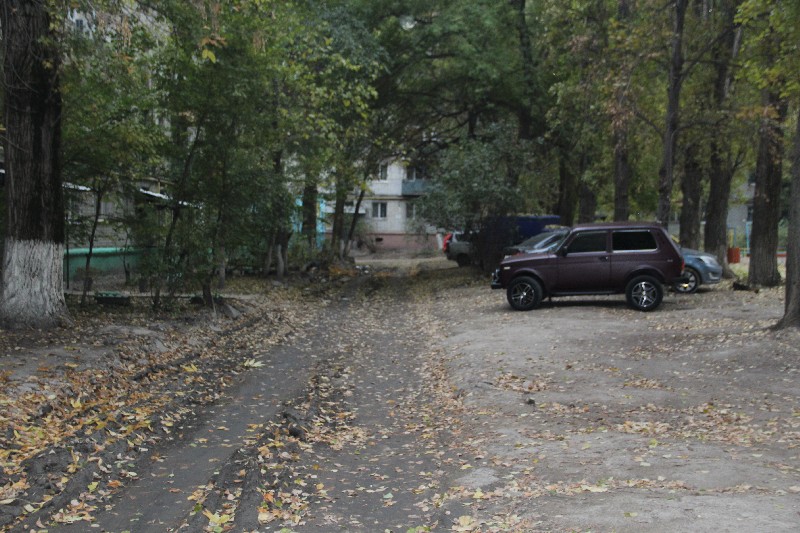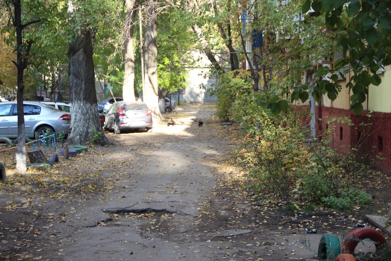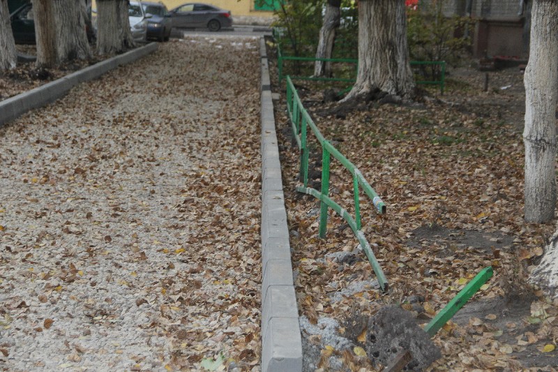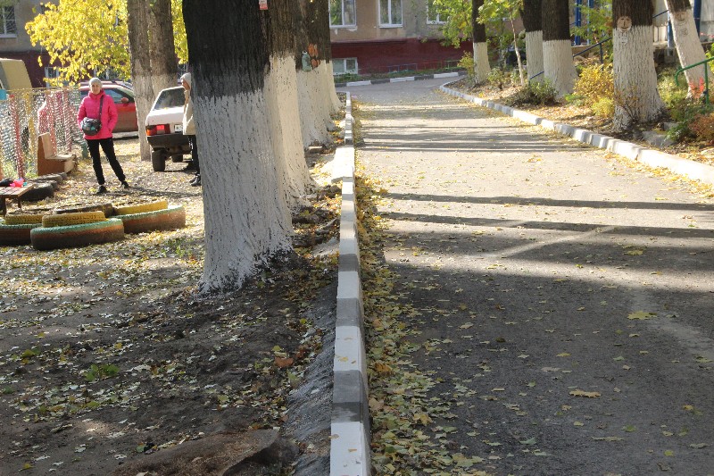 Приятный, светлый двор. Целый бортовой камень, ровный асфальт. Правда, под слоем листвы кое-где встречались небольшие участки шагреневой кожи. Да и выходы из подъезда еще требуется довести до ума, чтобы жителям не прыгать через бордюр. Ну а светлый еще и потому что из-за нехватки черной краски накреативили с бордюром. Покрашена оказалась только половина бортового камня, та, что белая, оставшаяся половина передает его естественный цвет.