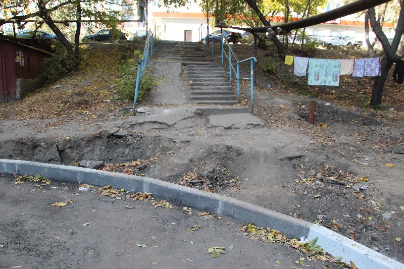 Удивление вызывает подход к обустройству городской среды. Установив бортовой камень и заасфальтировав проезд, почему-то оставили огромнейшую яму на спуске с лестницы к дому по Огородной, 91.