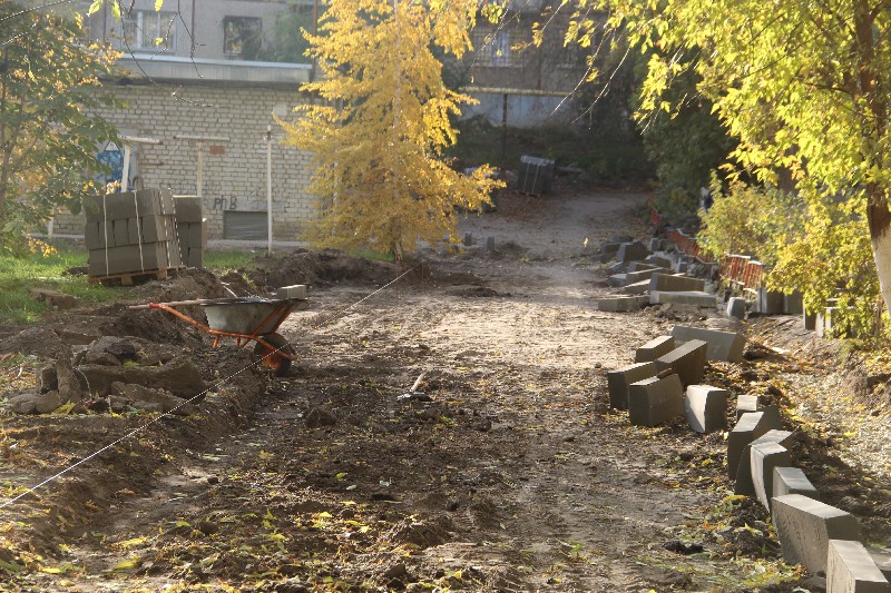 Сказать, что в Заводском районе работы совсем не двигаются, нельзя. Во дворе дома №17/11 по Пономарева установлен бортовой камень и уложено основание из щебня.