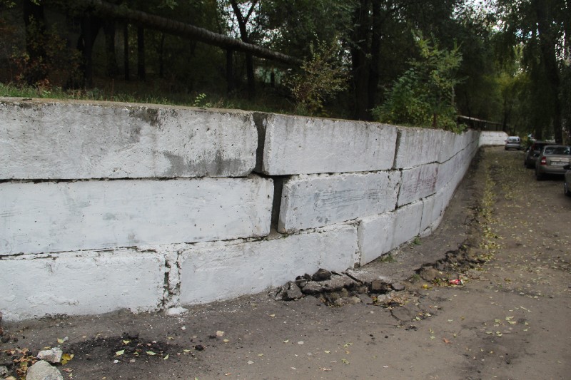 Частично провели демонтаж во дворах по улице Азина в домах №67-77 по нечетной стороне. При этом состояние дорожного полотна во дворах, подлежащее демонтажу, не самое плохое из тех, которые попали в программу по ремонту. А вот ремонт подпорной стены у дома №71 необходим, чтобы не произошло ее обрушение, подобное произошедшему на Моисеева 5.