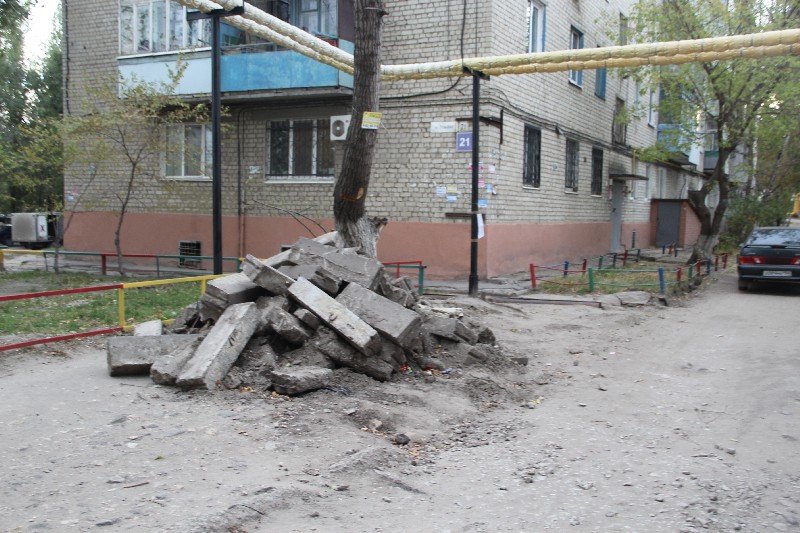 Какое-то оживление было на улице Ростовской во дворе дома №38. Но это были единственные рабочие, которых мы встретили во время нашего воскресного рейда. К тому же в этом дворе работы продвинулись дальше, демонтировано, в том числе, и основание дороги, по которому раскидали бортовой камень.
