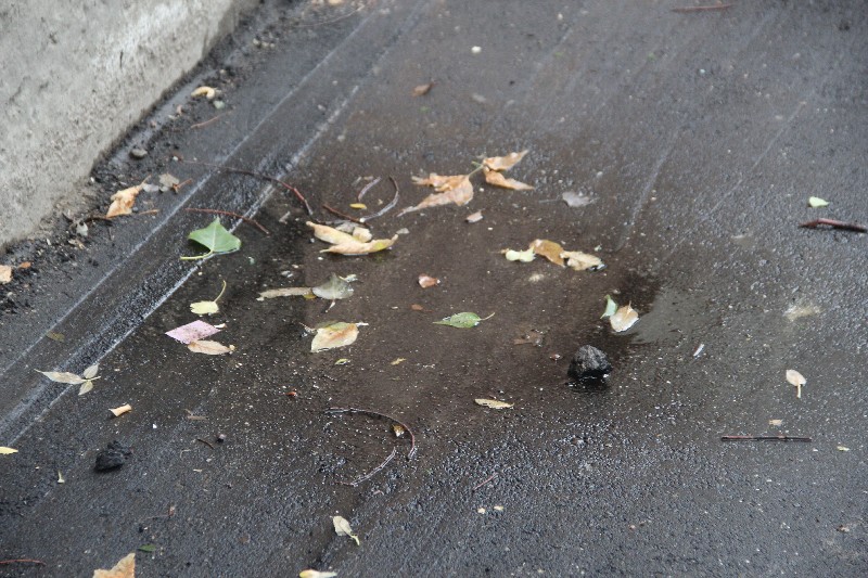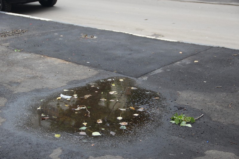 О том, как были выполнены эти работы, все ли нарушения устранены и все ли просадки удалены, можно судить по кадрам «Дорожного контроля», сделанным через день после дождя. Лужи в данном случае выступают как барометр брака. Одна из них, очень крупная по размеру, расположилась рядом с переделанным местом.