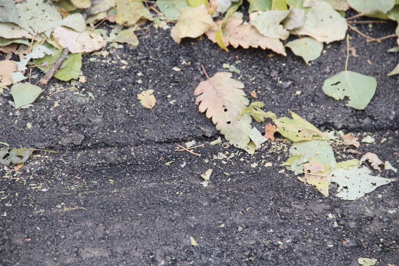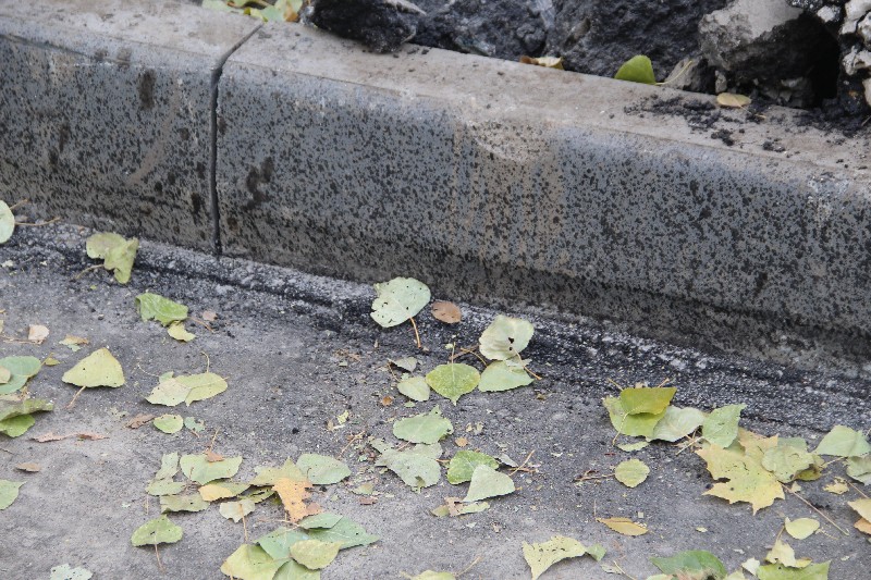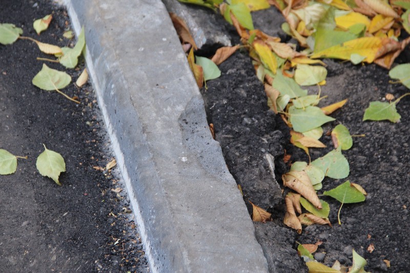 Что касается двора на Жуковского, то здесь асфальтобетон визуально уложен качественно. Нареканий не вызвали ни подъем в гору, ни линия сопряжения наклонных полос. Следов от дорожной техники не встретилось вообще. Единственный вопрос вызвал бортовой камень напротив шестого подъезда, от которого откололся крупный кусок. Кроме того, пока не исправлены и более мелкие сколы на бортовом камне.