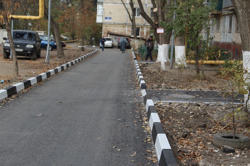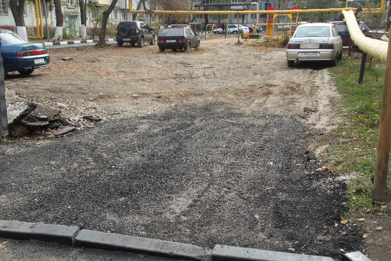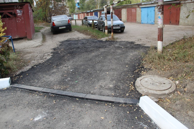Здесь подрядчиком выступила ООО «Лада», закончившая асфальтирование двора в прошедшие выходные. Одним из плюсов хотелось бы отметить организацию съездов с асфальтированной территории на грунт. Также хорошо установлены люки смотровых колодцев, которые подняли вровень с дорожным покрытием.