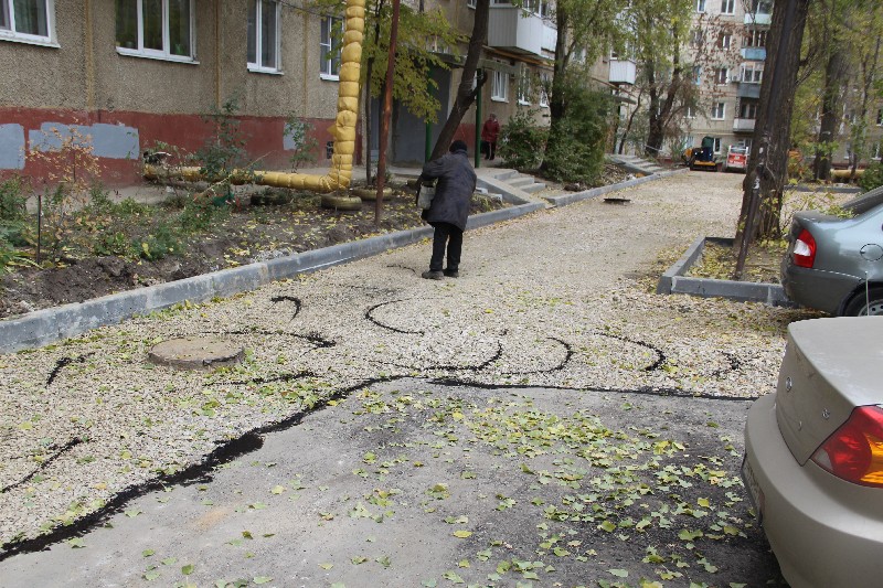 И пока в одних дворах Ленинского района работы заканчиваются, в других кипят полным ходом. Во дворе дома на Лебедева-Кумача, 84, о нарушениях в котором «Дорожный контроль» уже писал, подрядчик приступил к доукладыванию выравнивающего слоя асфальтобетона.