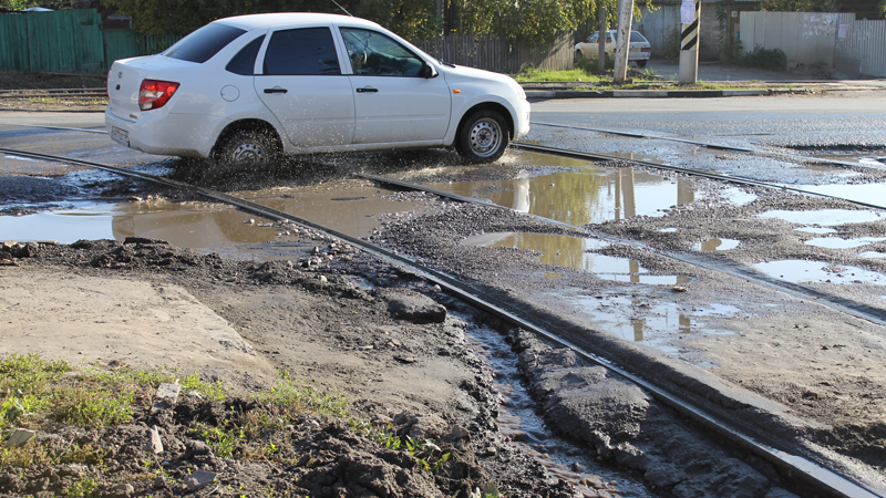 «Дорожный контроль» уже делал репортаж по данному участку в июне этого года, и с того момента изменения произошли только в худшую сторону. Ямы, скрываемые под толщью воды, стали ещё глубже, поэтому движение в правой полосе по направлению к Заводскому району на легковом автомобиле стало крайне опасным, а местами вовсе невозможным. В час пик проезд по этому участку дороги превращается в одну сплошную пытку, движение транспорта замирает, создавая длинную пробку. Ситуацию усугубляют пересекающие дорогу трамвайные рельсы.
