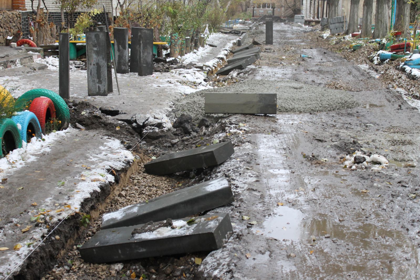 Кроме того, в отстающем по темпам работ Заводском районе, под дождем, в грязи, сырости и снеге ведутся работы по установке бортового камня во дворах на Огородной, 87 и Ростовской, 38. В отличие от укладки в сырую погоду асфальта, это не нарушение. Однако условия, в которых сейчас проходят работы, человеческими назвать трудно.