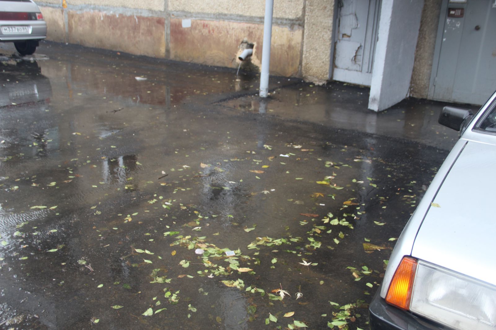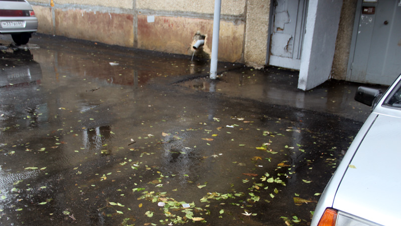 Например, во дворах по Топольчанской, где работы проводила фирма АО «Автогрейд», водоотведение с вышестоящего дома №3 идет через четвертый подъезд дома №5 и на придомовую территорию, скапливаясь на отмостке возле дома.