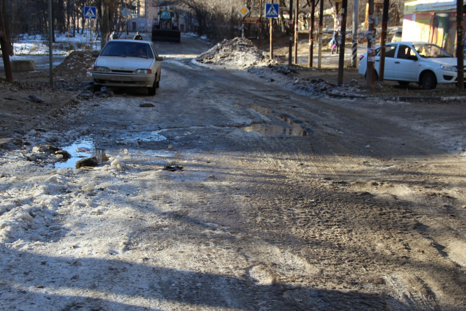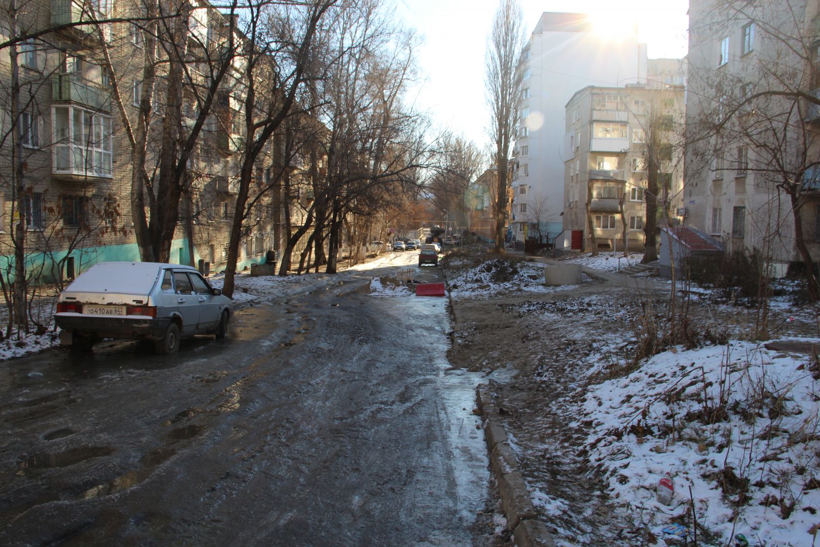 Например, поток воды с места аварии превратил улицу Ламповую в каток, по которому саратовцы вынуждены добираться до детской поликлинники №5 и детской городской больницы №7. Автолюбителям приходится лавировать по ровно залитому дорожному полотну между вмерзшими машинами и местом старых вскрышных работ, которые никто не спешит закапывать. А так как дорога идет со значительным уклоном, делать это автолюбителям приходится с большим вниманием.