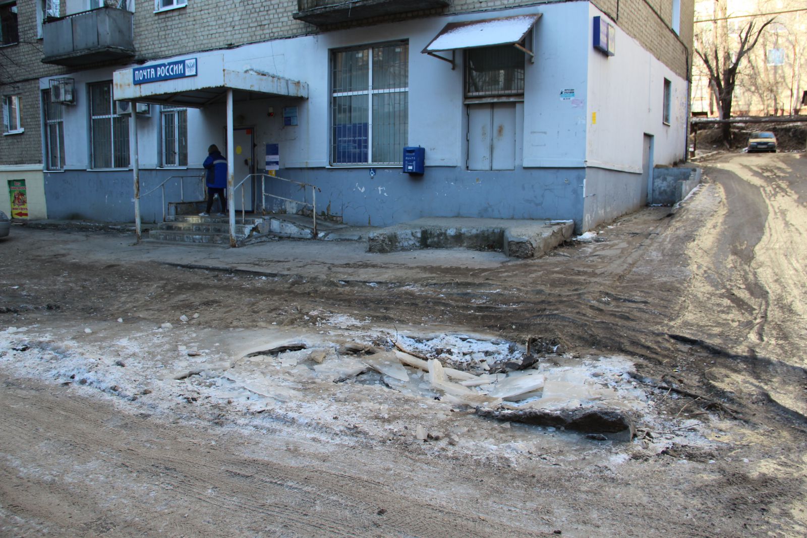 Не только объекты здравоохранения, но и 44-ое отделение Почты России, находящееся в доме №10 по Студеной улице стало труднодоступно для местных жителей. Кроме ледяных наростов, в которые превратилась дорога, им необходимо преодолеть еще одно старое место вскрышных работ, на этот раз ничем не обозначенное, прямо у входа в почтовое отделение. Насколько глубок провал, выяснить на данный момент трудно, так как он покрыт слоем льда.