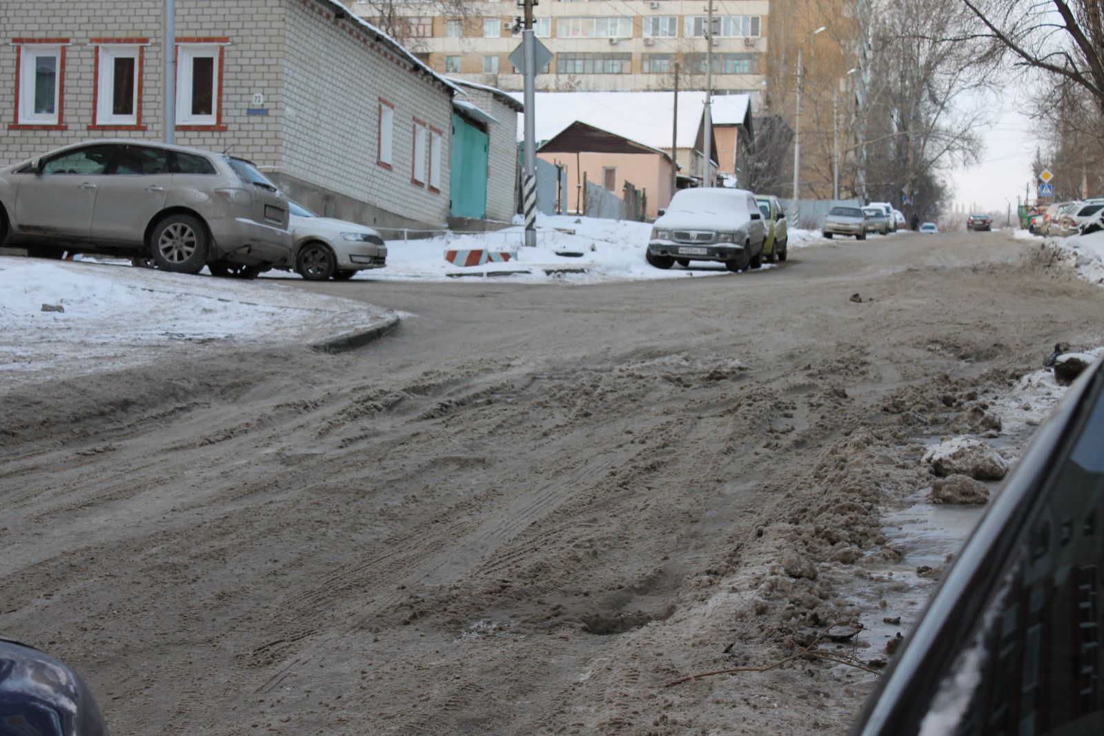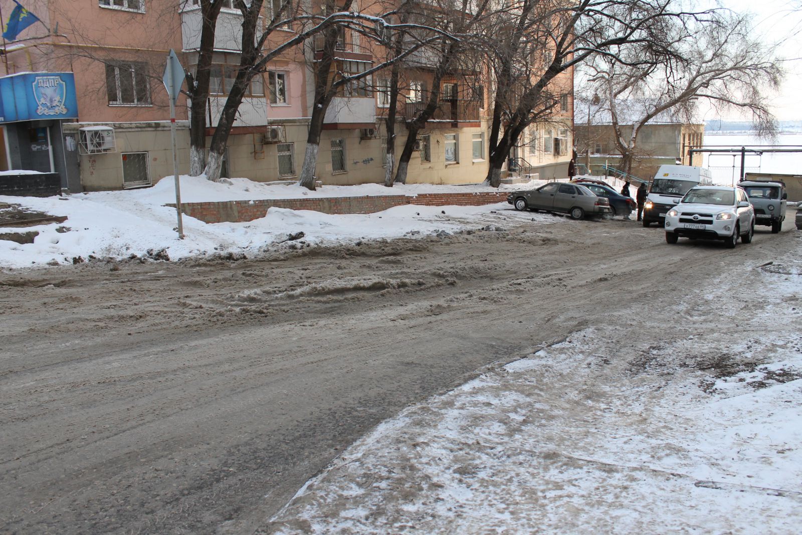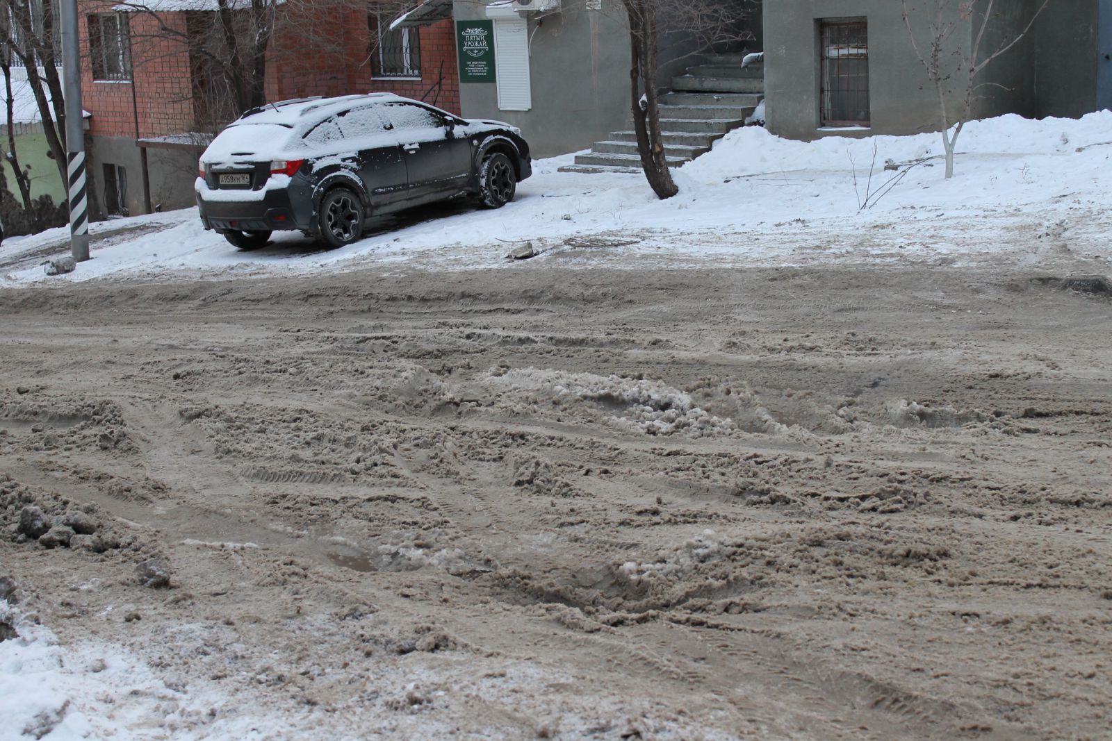 Полоса дороги, ведущая в гору, покрыта наледью и снежной кашей. Месиво, вероятнее всего, стало результатом небольшой коммунальной аварии. И хотя течь устранена, саму дорогу не привели в эксплуатационное состояние.