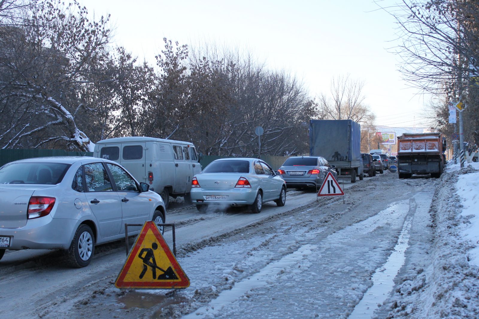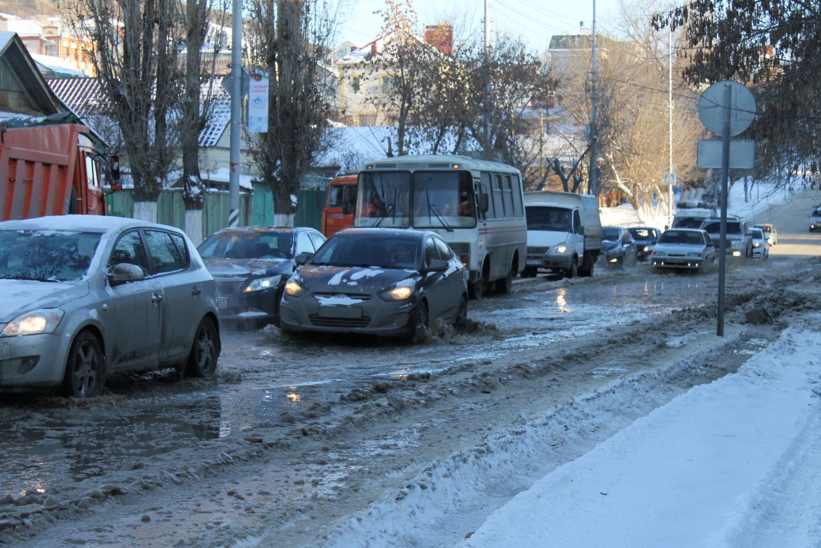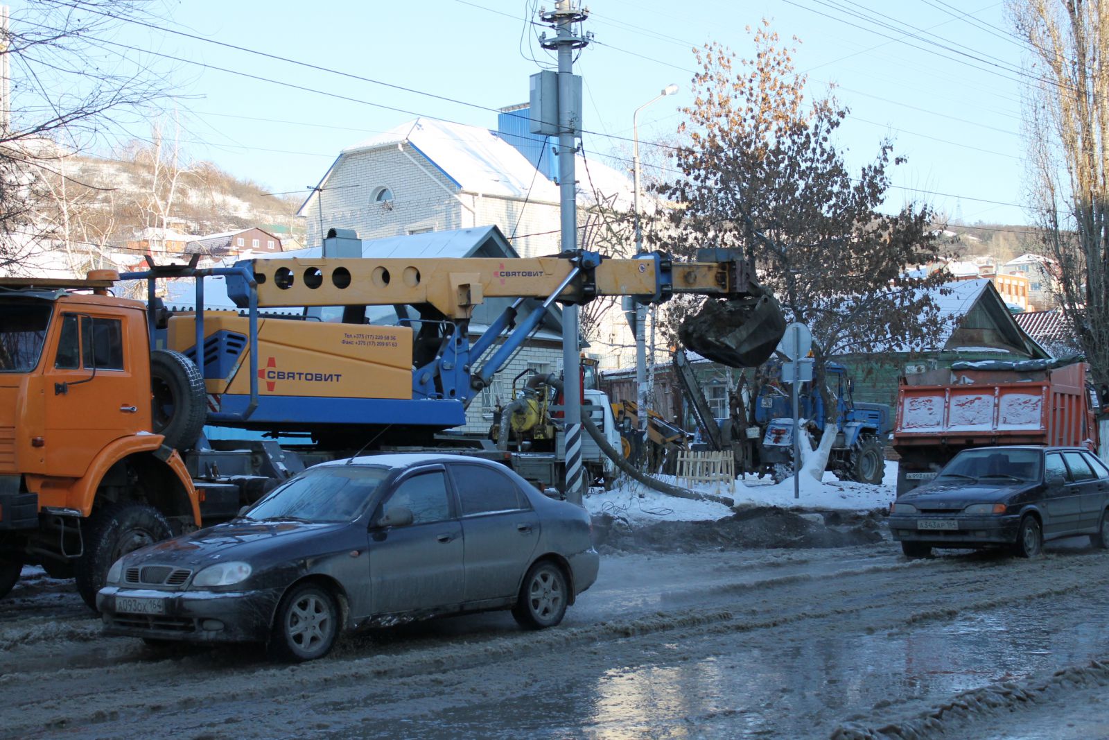 Сейчас над устранением аварии работают коммунальщики с применением спецтехники. При помощи помпы вода откачивается прямо на дорожную часть. Это, в свою очередь, затрудняет движение транспорта и сокращает ширину проезжей части дороги до одной полосы. Некоторые смелые автолюбители все же не боятся и рискуют проехать через это «море» из снежной каши и льда. Между тем, скопившееся месиво развезли вниз по улице Радищева, поэтому теперь затруднен подъем в гору.
