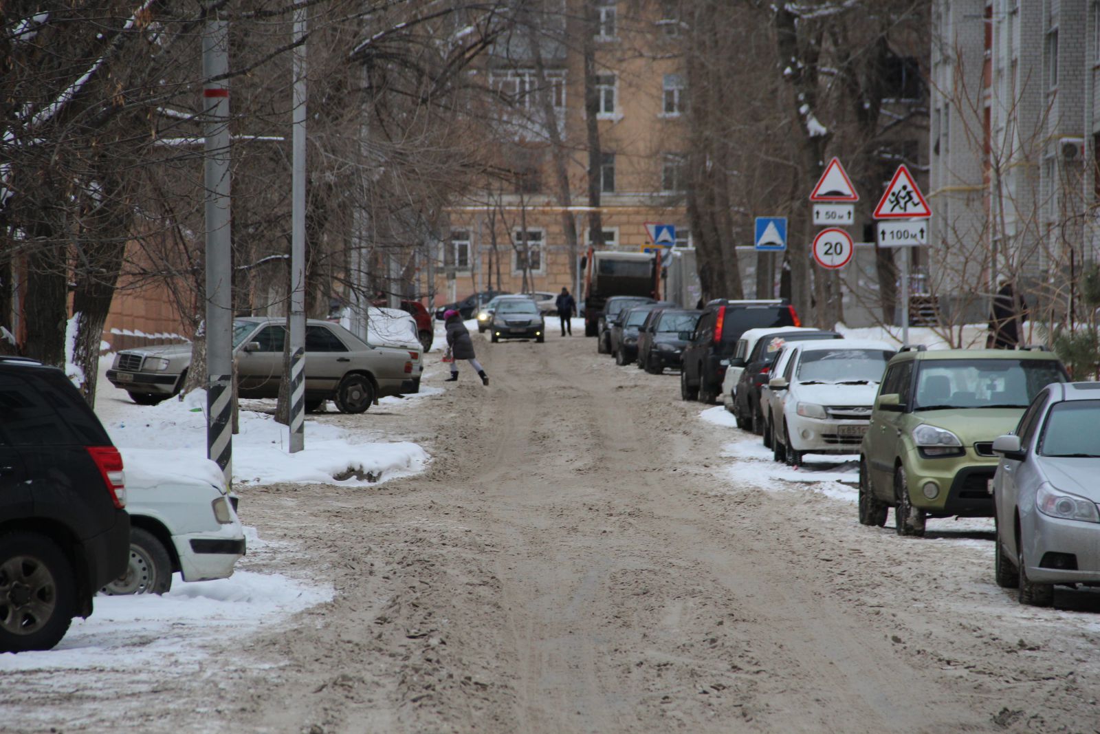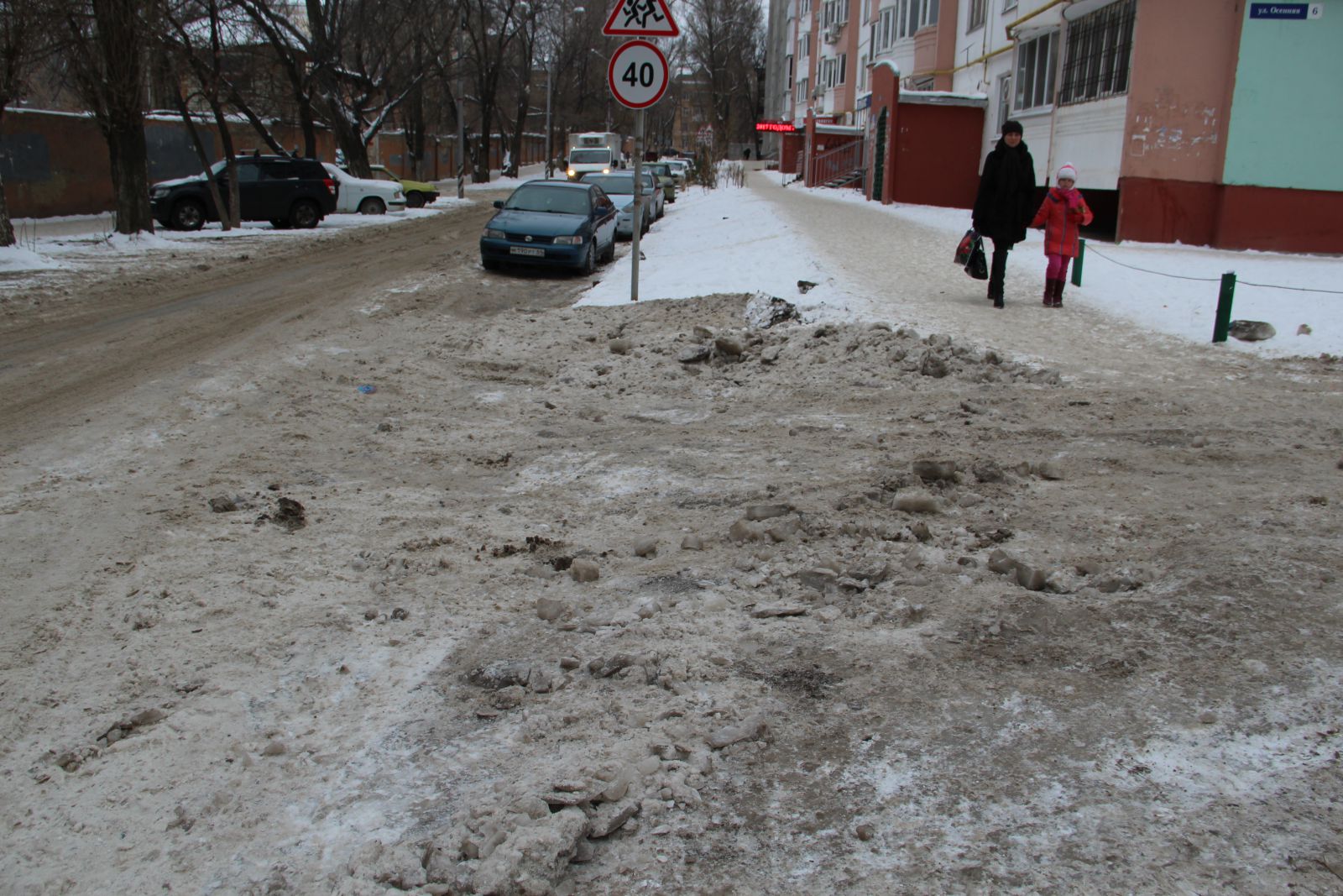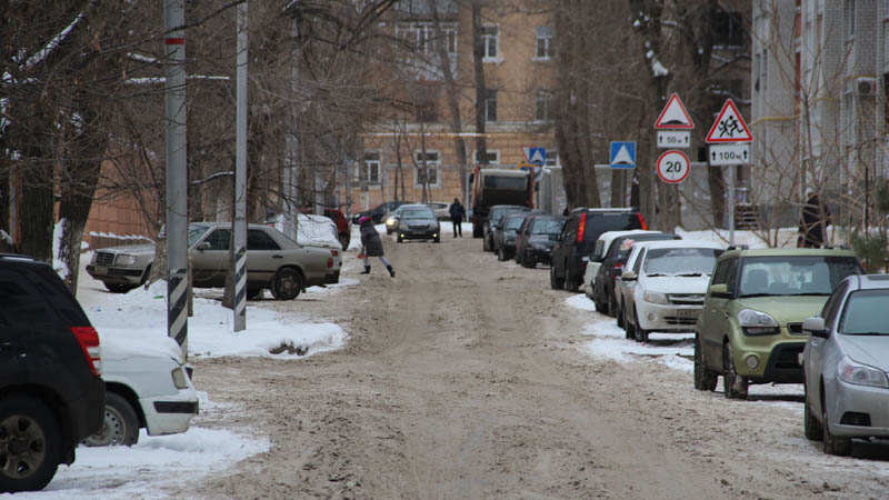 Так, на улице Осенней наледь устранять не спешат, но грейдером или похожей техникой сравняли наиболее выступающие надолбы. Дорога сузилась, как и переживала Ирина, до одного ряда. Но винить только дорожные службы в этом нельзя. Для расчистки всей проезжей части необходимо убрать множество припаркованных автомобилей местных жителей, которые полностью занимают одну полосу дороги.