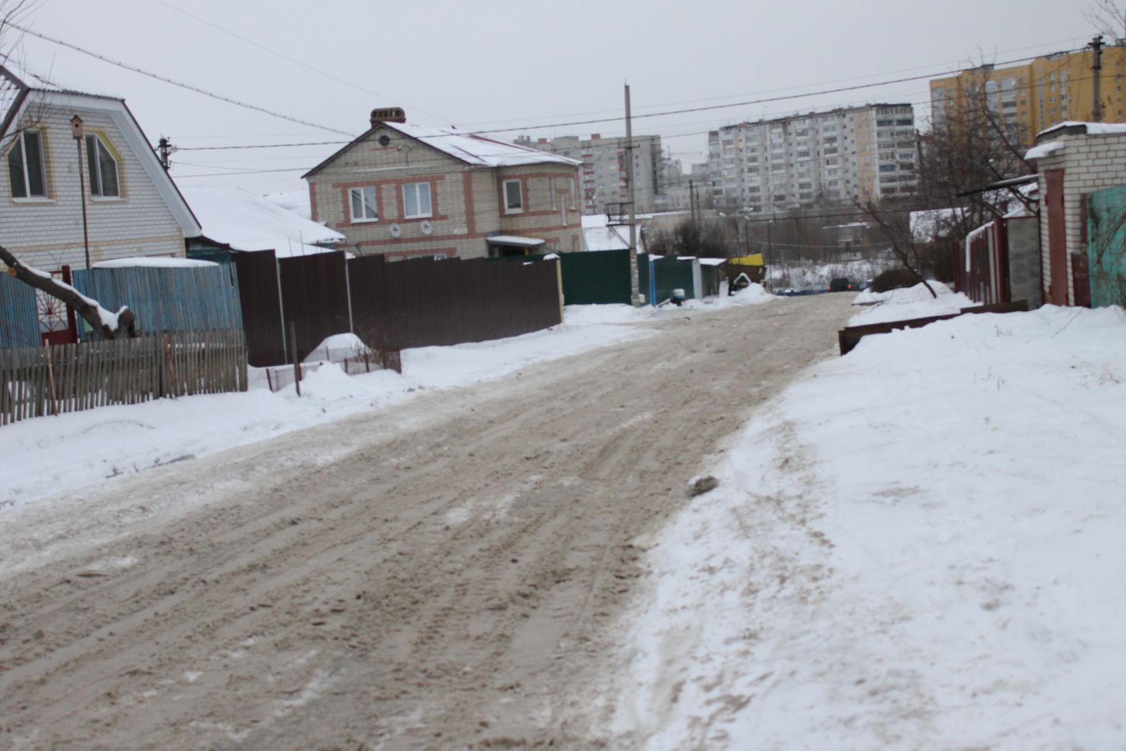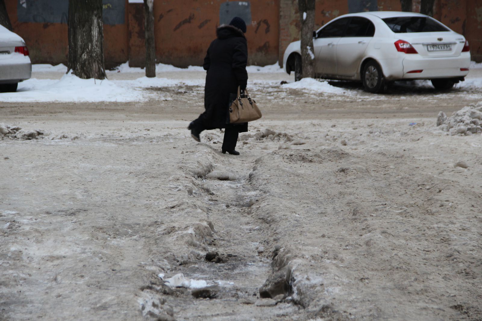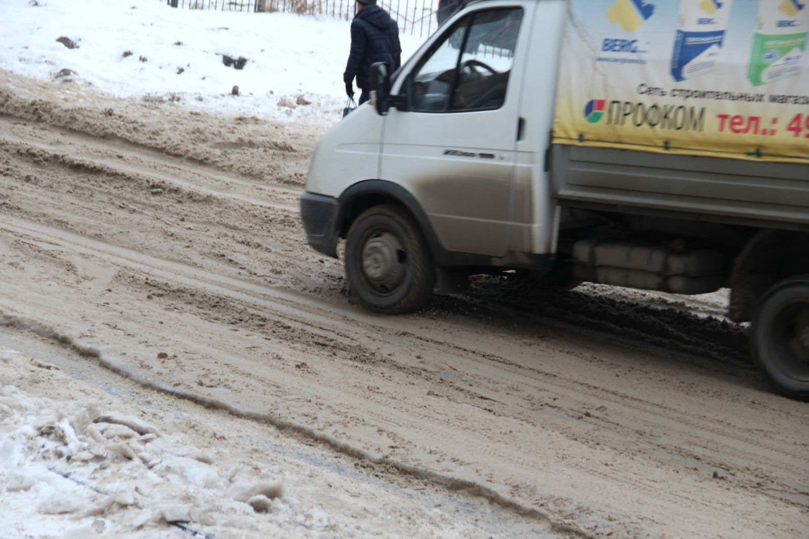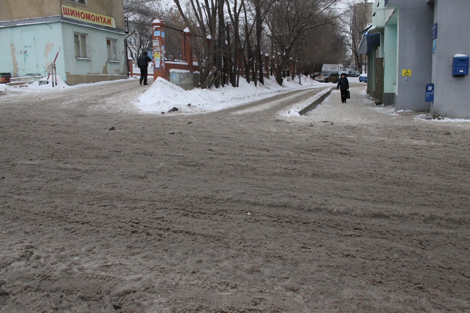 Еще более печально выглядит ситуация на 4-й Нагорной улице, куда даже не загоняли грейдер. Машины, в том числе и маршрутные такси №14, продолжают скользить по колеям через многочисленные ледяные надолбы. Пешеходы, вынужденные передвигаться по проезжей части, рискуют не только упасть, но и угодить при этом под колеса автомобиля, не способного экстренно остановится на ледяной поверхности.