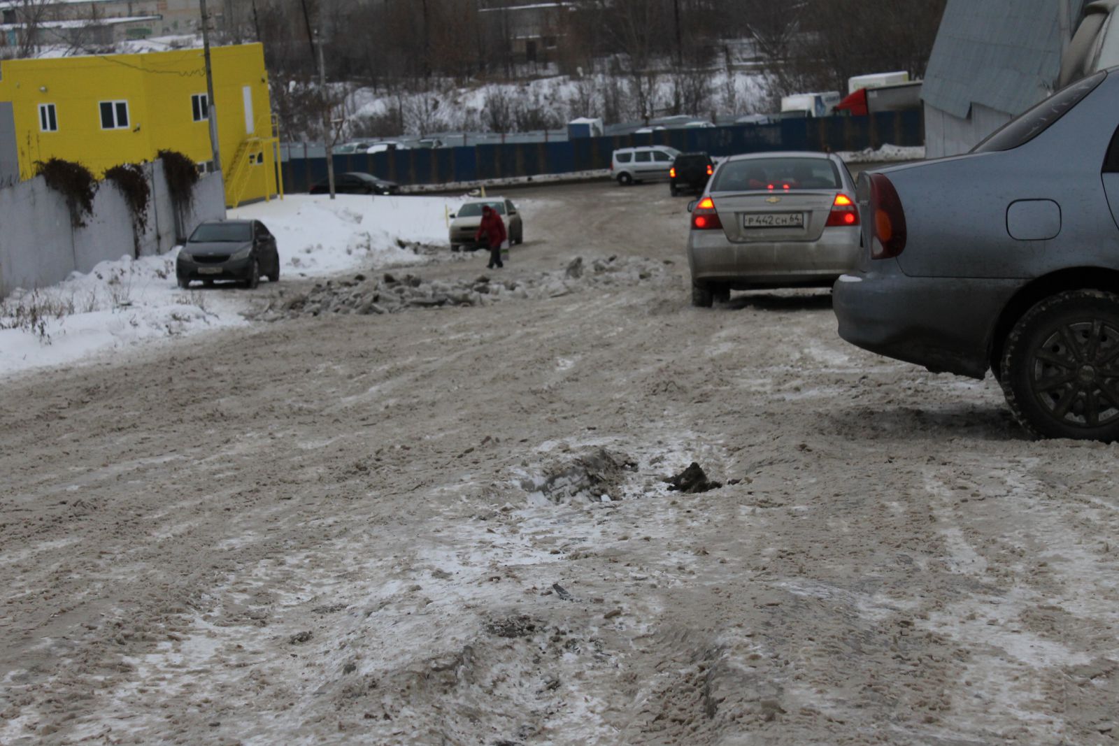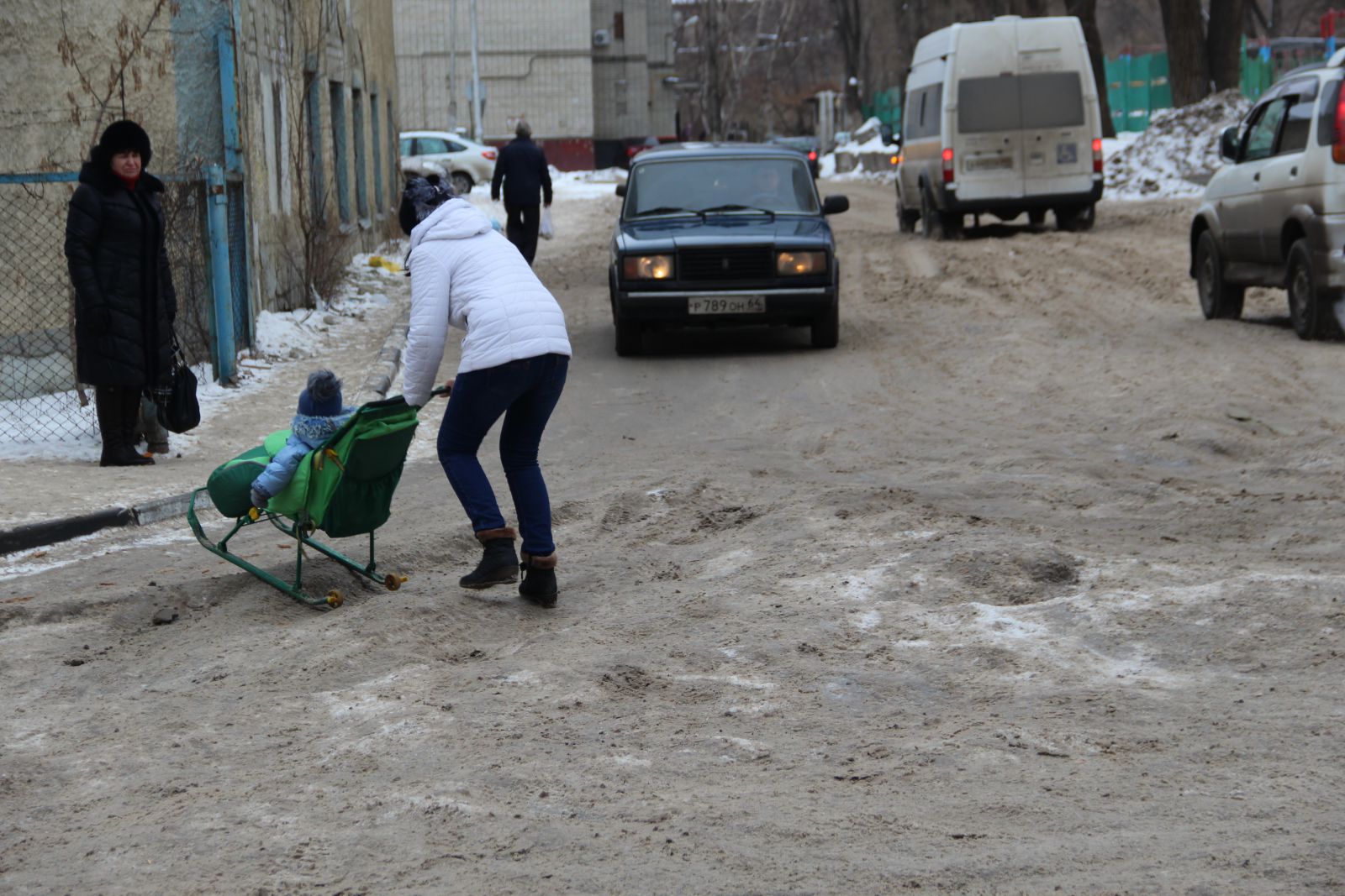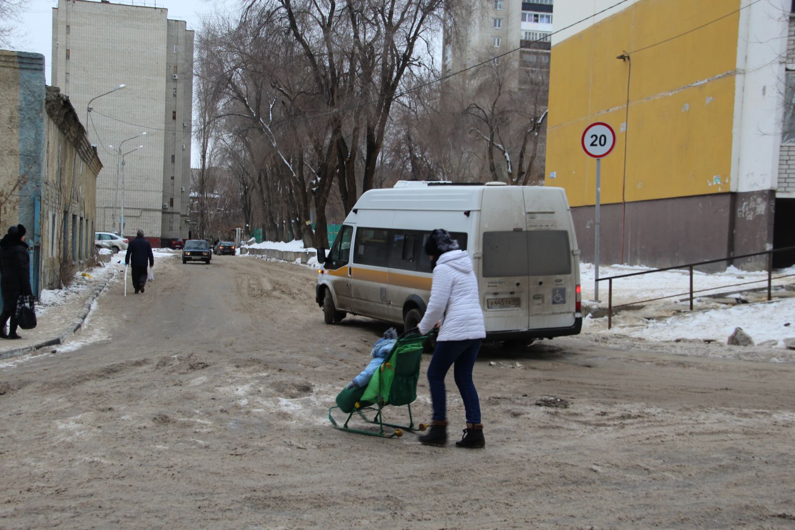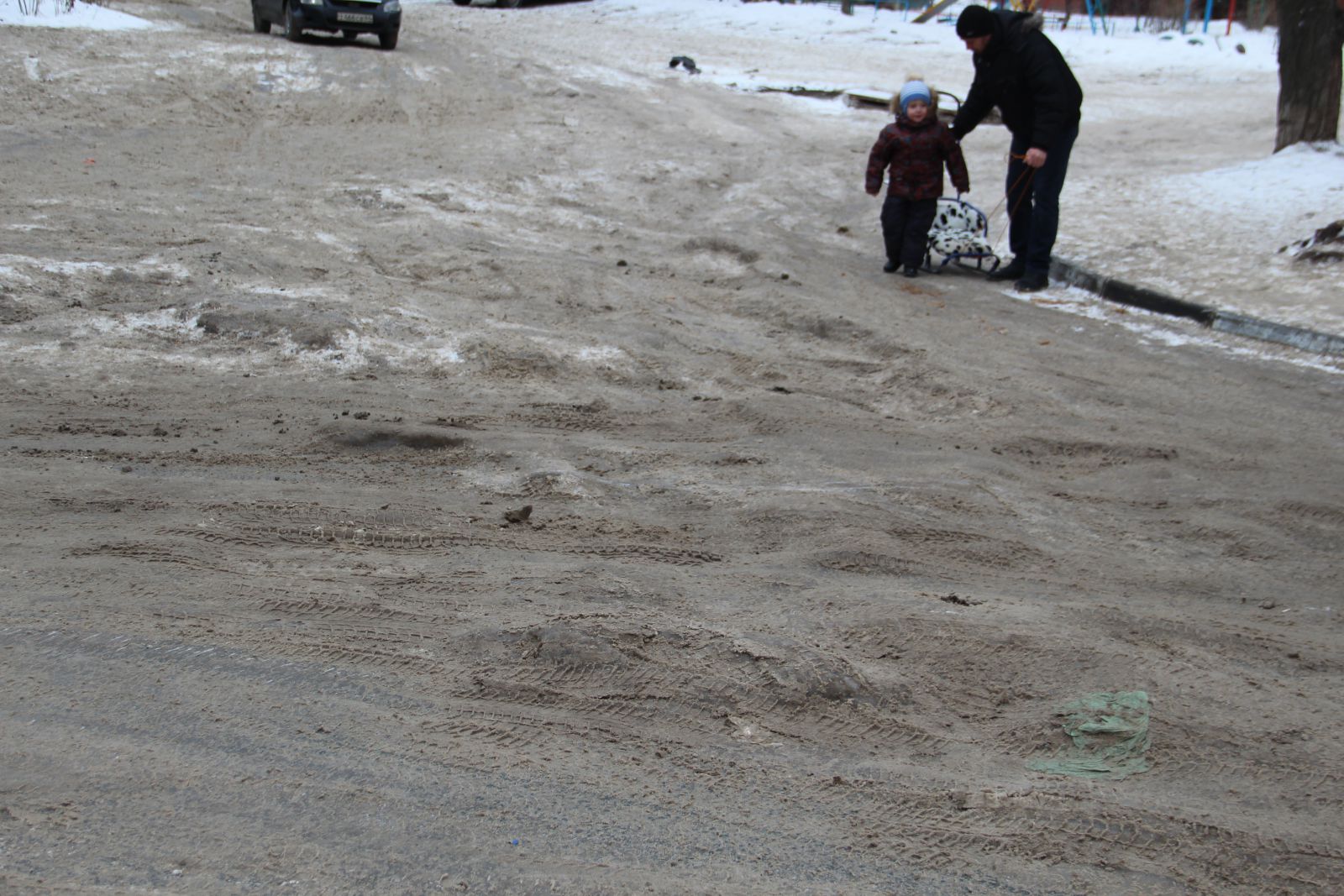 Еще более печально выглядит ситуация на 4-й Нагорной улице, куда даже не загоняли грейдер. Машины, в том числе и маршрутные такси №14, продолжают скользить по колеям через многочисленные ледяные надолбы. Пешеходы, вынужденные передвигаться по проезжей части, рискуют не только упасть, но и угодить при этом под колеса автомобиля, не способного экстренно остановится на ледяной поверхности.