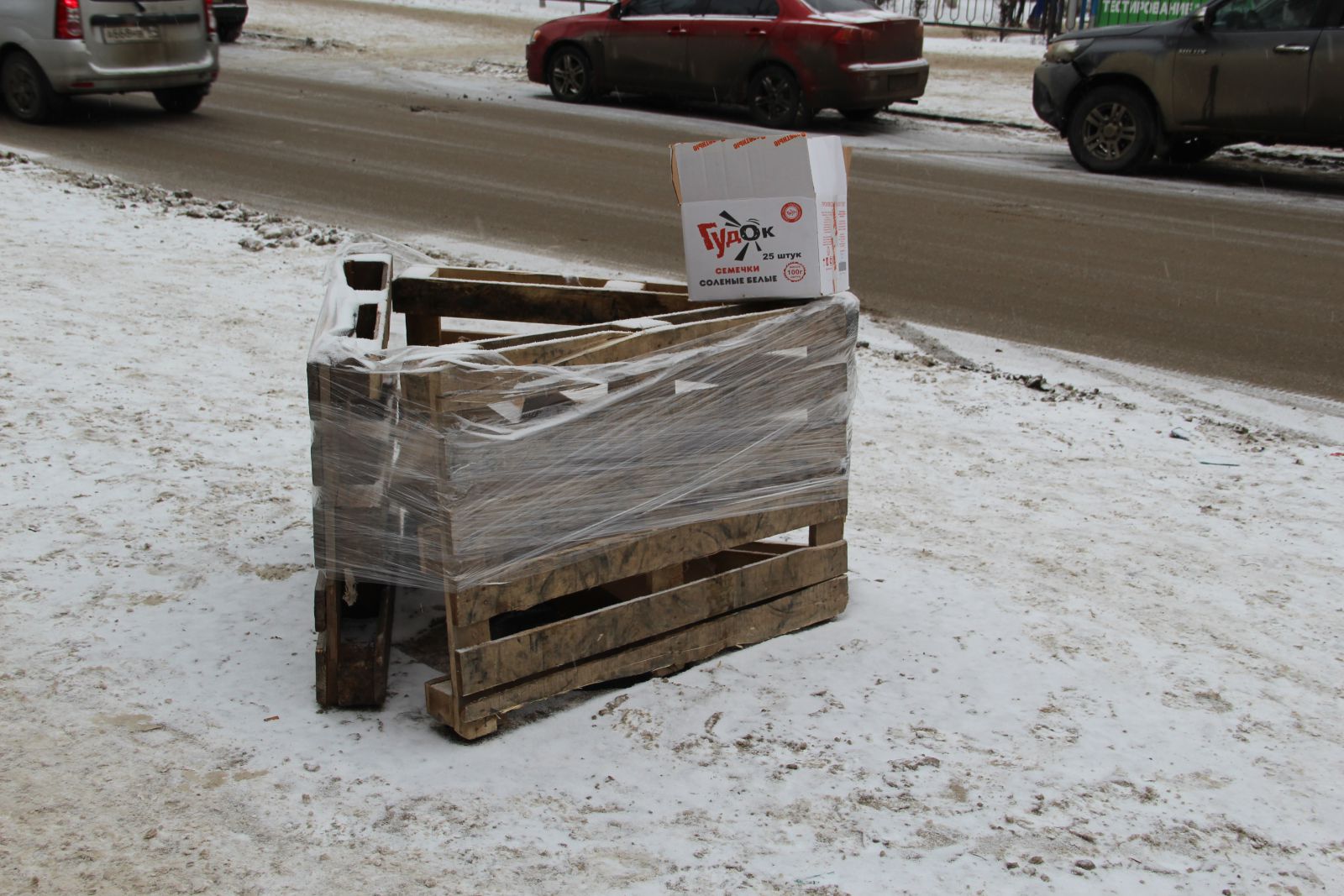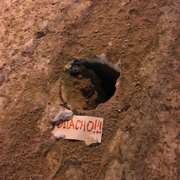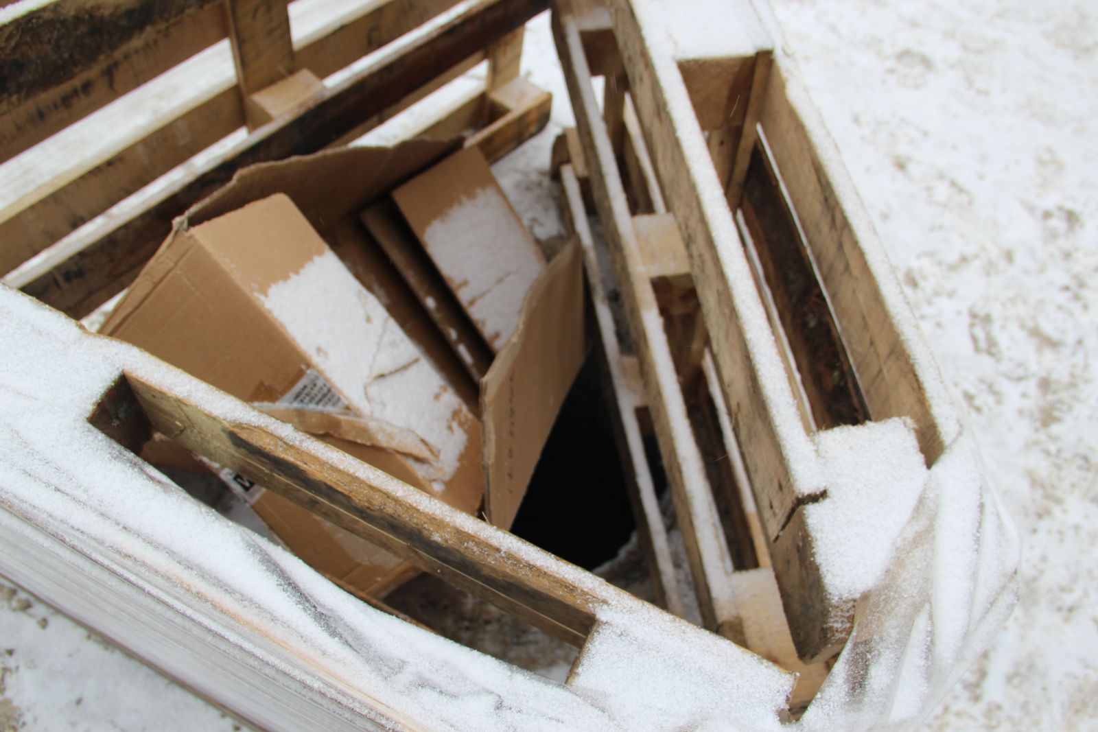 Инспектор «Дорожного контроля» посмотрел, произошли ли изменения на тротуаре. За выходные дни написанную как будто кровью табличку «Опасно» заменили на конструкцию из деревянных поддонов, ограждающую так и оставшийся открытым смотровой колодец. Вместе с этим, необходимых знаков для обозначения опасности и препятствий в данном месте не имеется. Так и приходится пешеходам рассчитывать на выдумку и смекалку неизвестных, которые огораживают открытые люки подручными средствами.