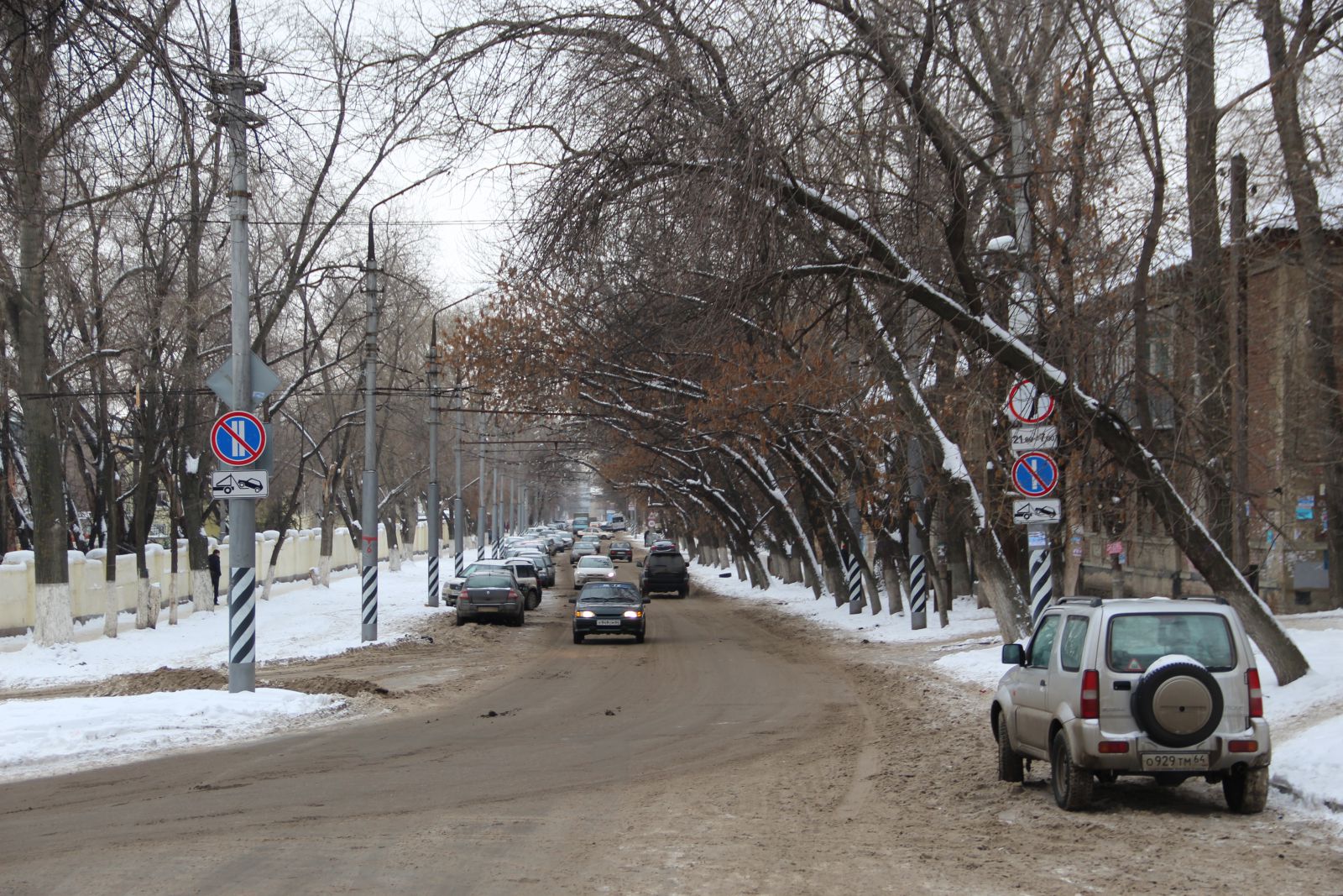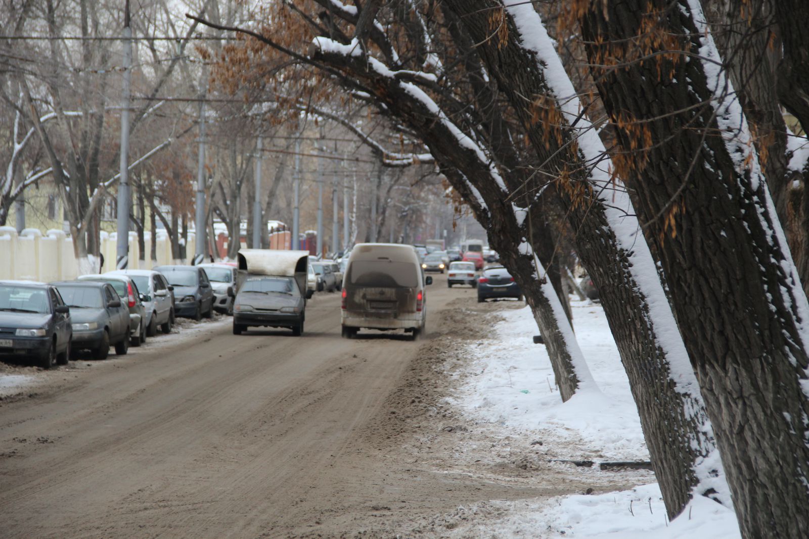 На другой стороне Аткарской, занятой автомобилями, дорога также не расчищена до бордюра. При этом автомобили, чтобы оставить больше места на проезжей части, паркуются путем заезда частично на «зеленую зону», сливающуюся из-за обилия снега с дорогой.