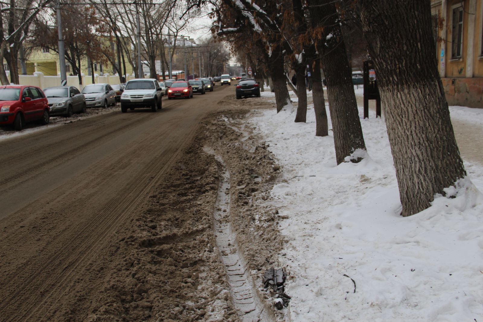 Инспектор «Дорожного контроля», побывавший на месте, обнаружил, что действительно на свободной от припаркованных машин полосе улице Аткарской снег не убран на значительном расстоянии от бордюра, местами занимая более метра дорожного полотна.