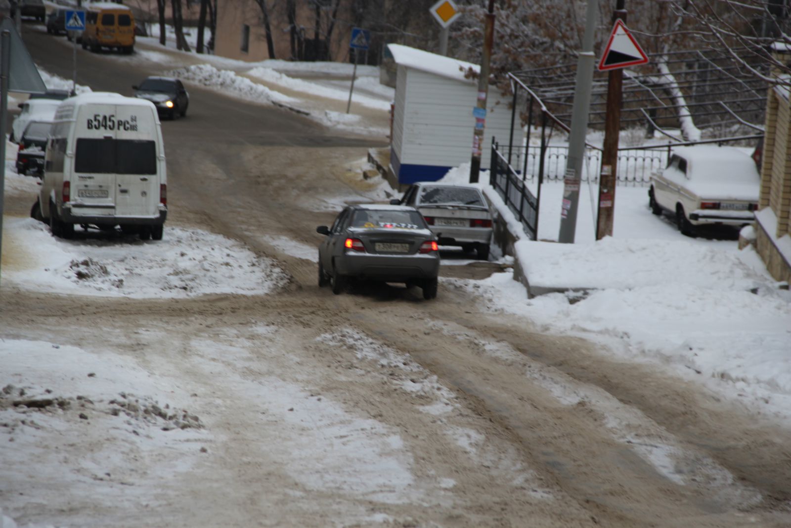 Идущая под крутой уклон улица Деловая на этом отрезке покрыта снегом, скрывающим наледь. Фактически движение осуществляется по колее, проложенной транспортом местных жителей, по одной полосе, где встречным машинам просто негде разъехаться.