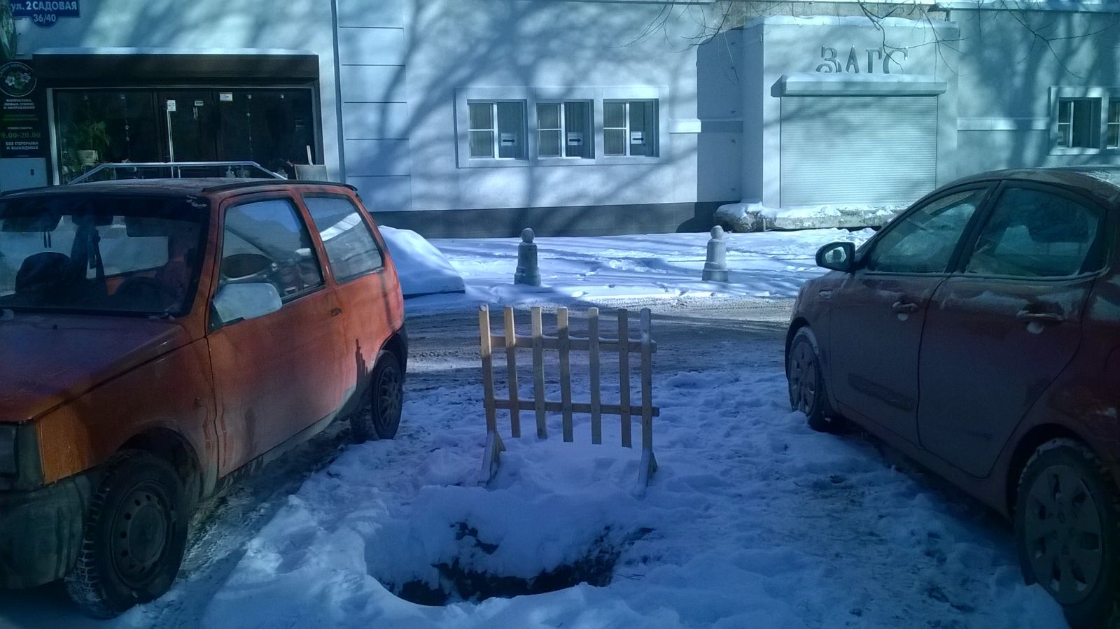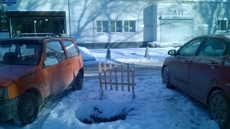 Хотелось бы отметить, что деревянные заборчики - не слишком надежное и недолговечное обозначение препятствий, без светоотражающего покрытия они плохо различимы в темное время суток. Выпавший снег также скрадывает очертания ловушки, расположившейся рядом со школой №95, а ведь дети часто бывают очень рассеяны и могут просто не обратить внимания на опасность, устранить которую должны были в течение нескольких часов, а не месяцев.
