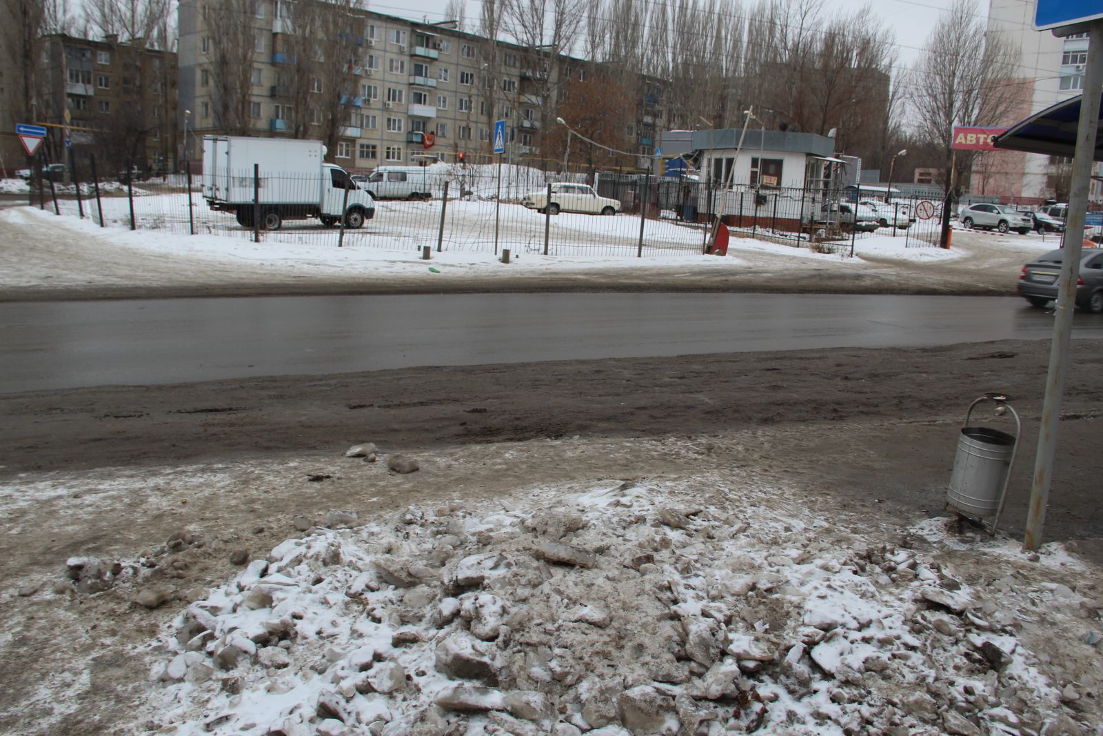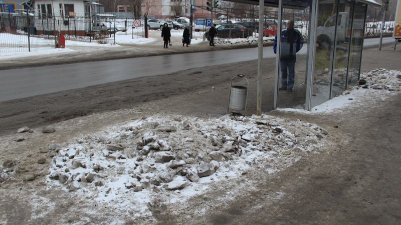 В редакцию «Дорожного контроля» обратилась жительница Ленинского района Светлана, рассказавшая о покрытых наледью остановках общественного транспорта. На остановке у дома №21 по улице Тархова наледь не убрана более двух месяцев после коммунальной аварии. «Невозможно сесть в автобус и маршрутку безопасно. Автобусы не могут подъехать к остановке, останавливаются на проезжей части» - рассказала на Светлана. Попытка очистить остановку от льда была, правда, работы затронули лишь территорию самого остановочного павильона. Кучу колотого льда свалили здесь же. Сам подход к остановке и к дороге представляет из себя ледяное поле.