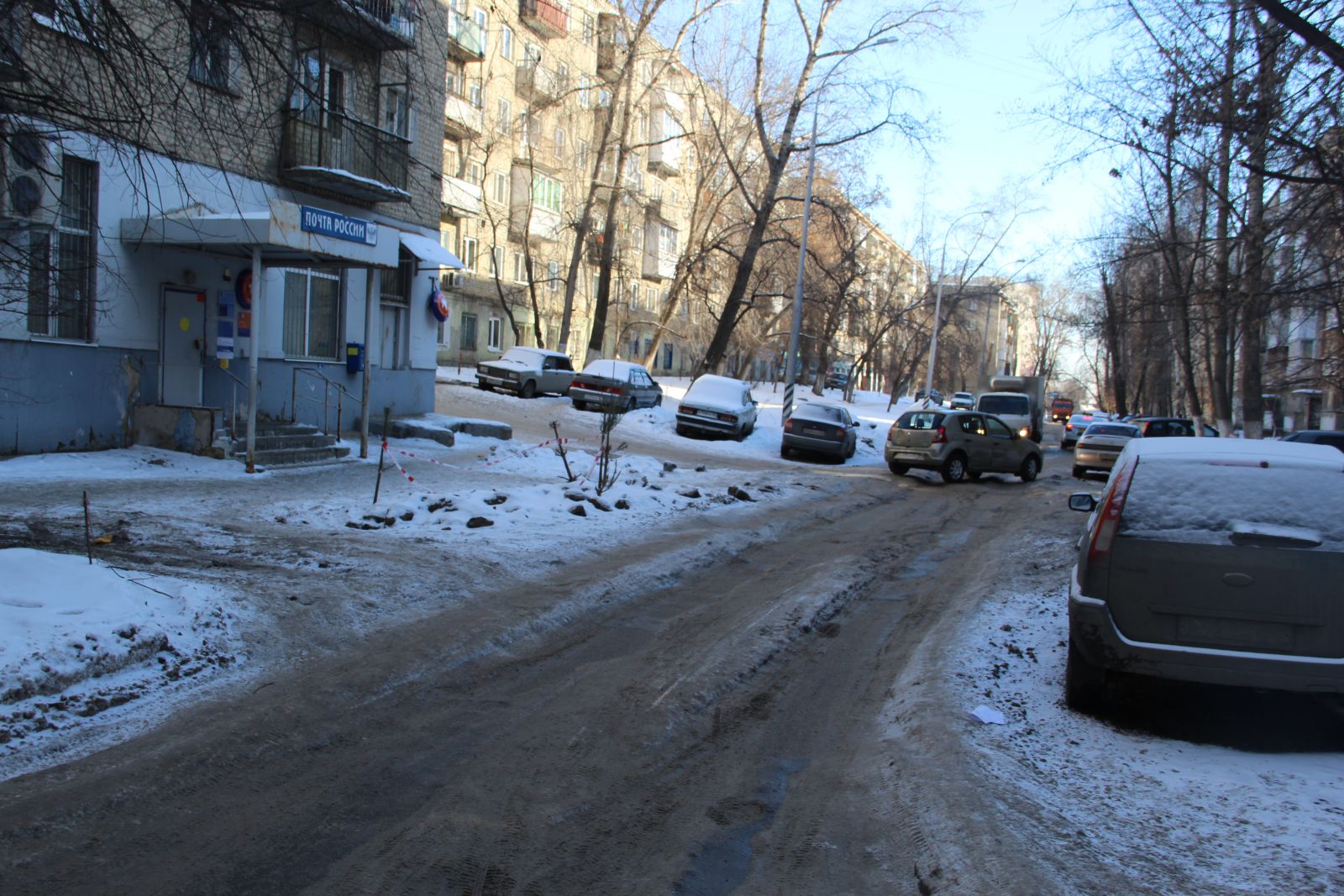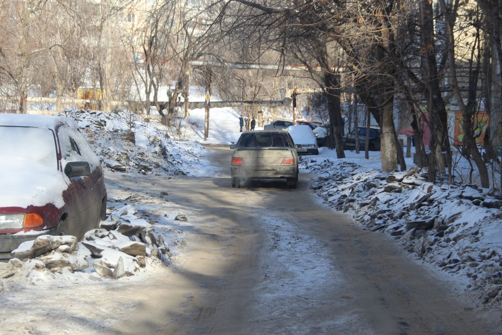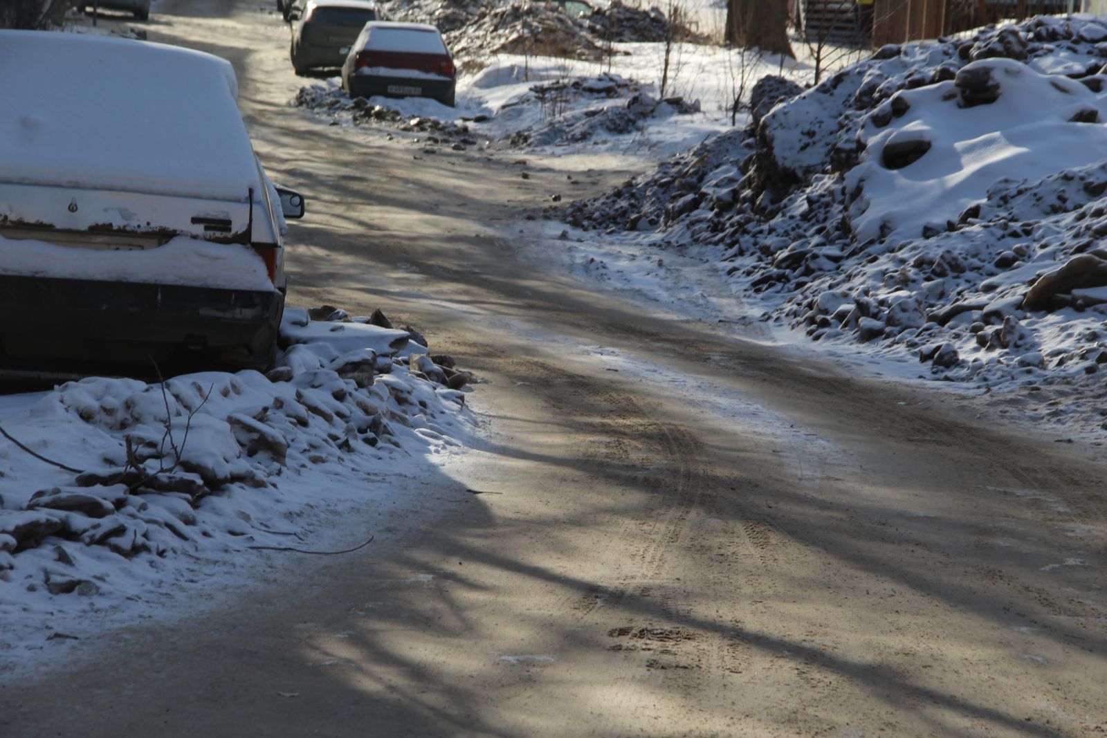 К сожалению, из-за припаркованных на дороге машин, некоторые из которых капитально вморожены в лед, очистить проезжую часть на всю ширину не представляется возможным. Из-за этого единственная доступная полоса для движения на участке Ламповой улицы от Осенней до Студеной петляет между «памятниками» коммунальным авариям.