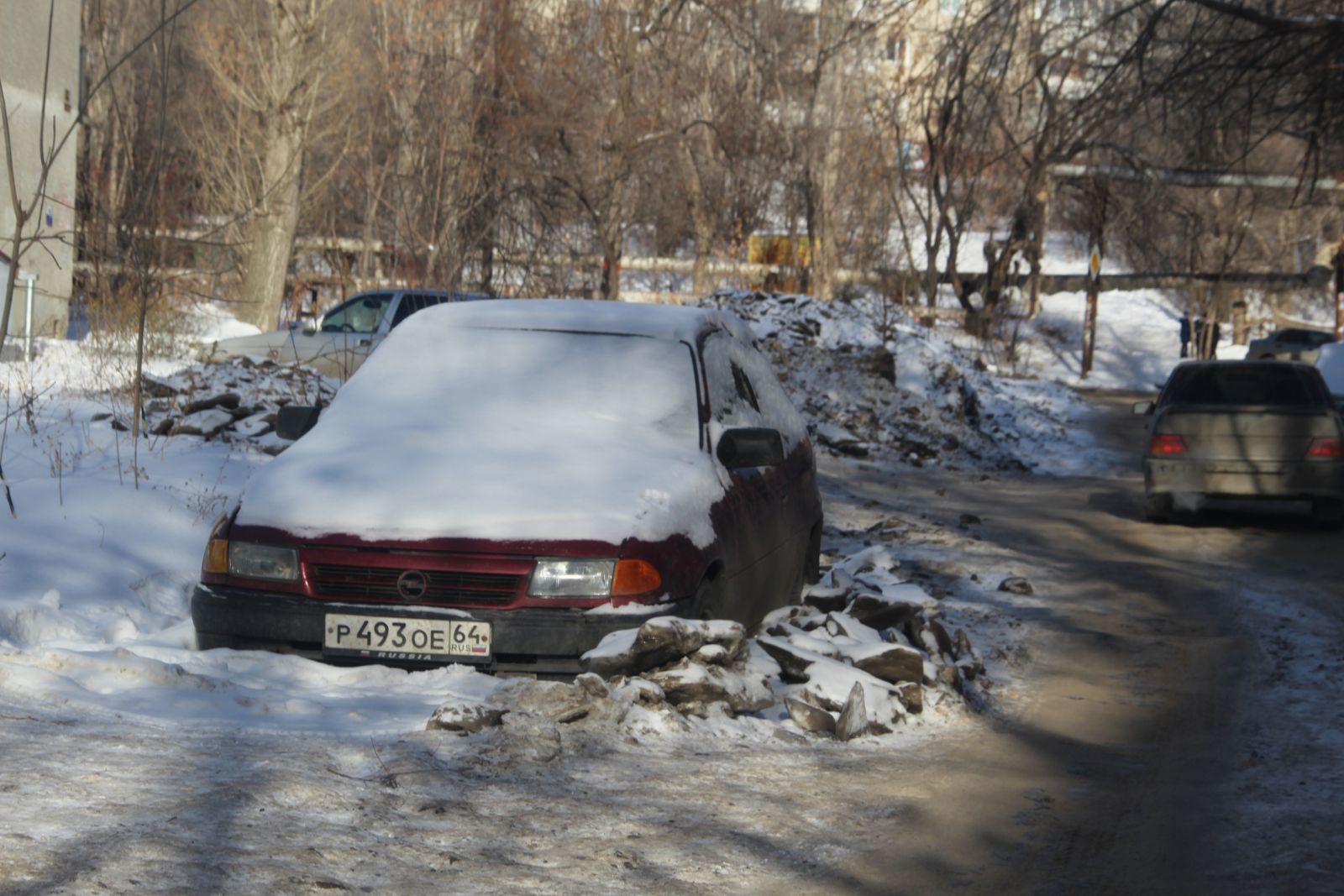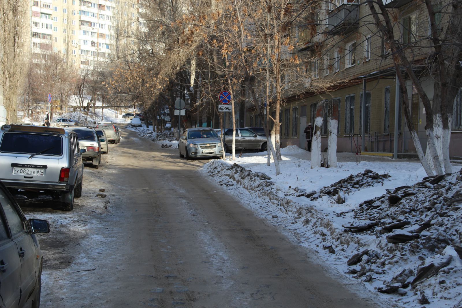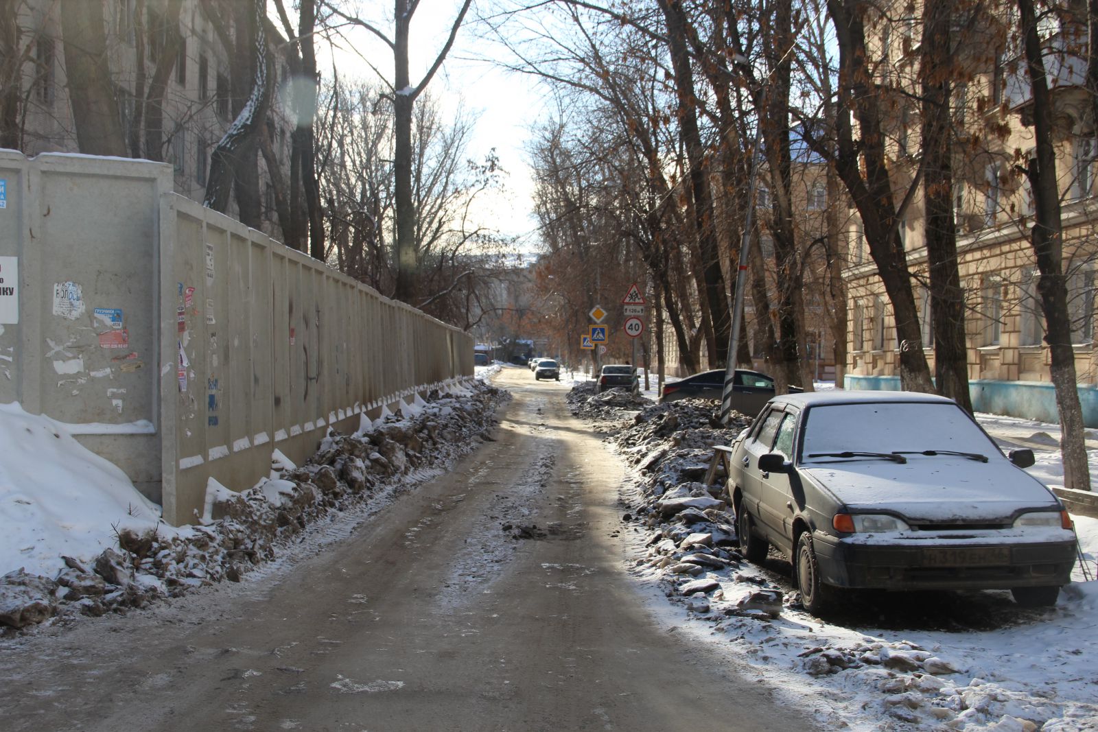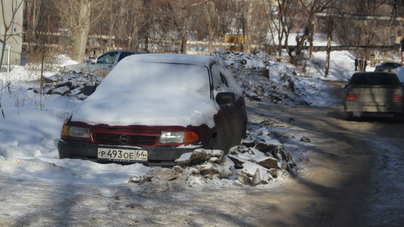 К сожалению, из-за припаркованных на дороге машин, некоторые из которых капитально вморожены в лед, очистить проезжую часть на всю ширину не представляется возможным. Из-за этого единственная доступная полоса для движения на участке Ламповой улицы от Осенней до Студеной петляет между «памятниками» коммунальным авариям.