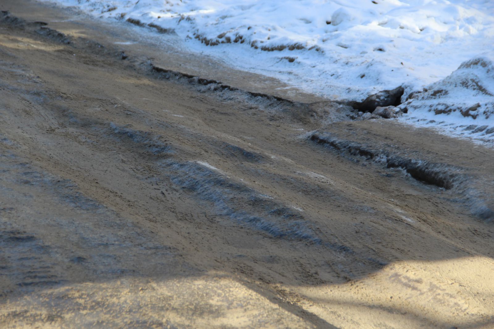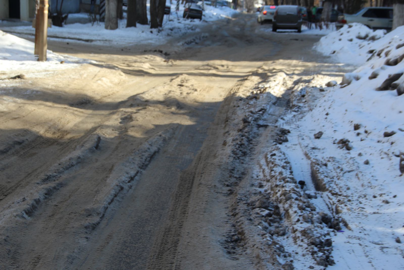 Пока чистили Ламповую, затапливало водой и сковывало льдом соседнюю Студеную, которая связывает жителей окрестных домов с проспектом Строителей. Сейчас на дороге глубокие ледяные колеи, из которых не всегда удается выехать, ледяные бугры и постоянно образующийся затор из-за невозможности разъехаться встречным потокам автомобилей.