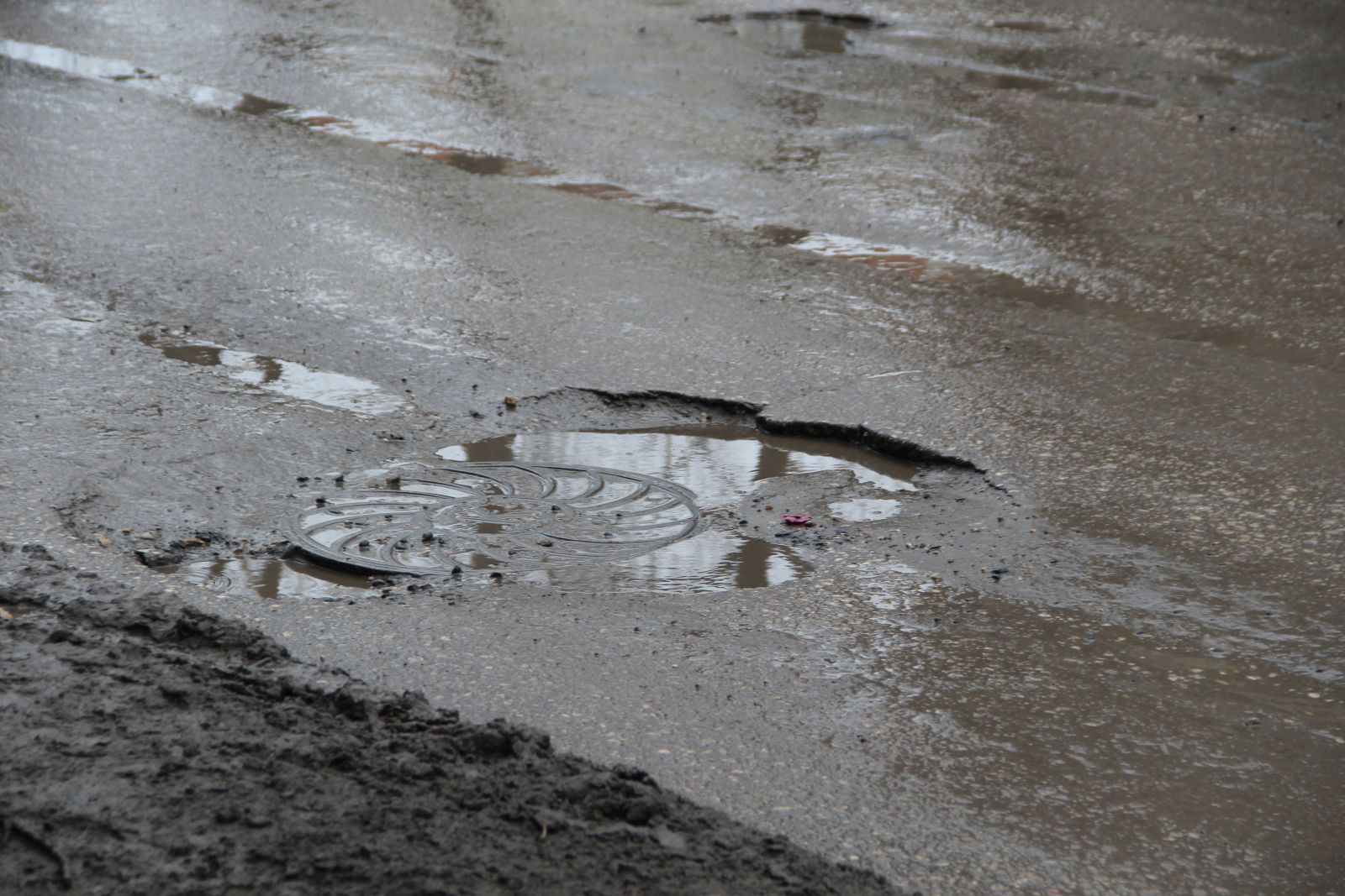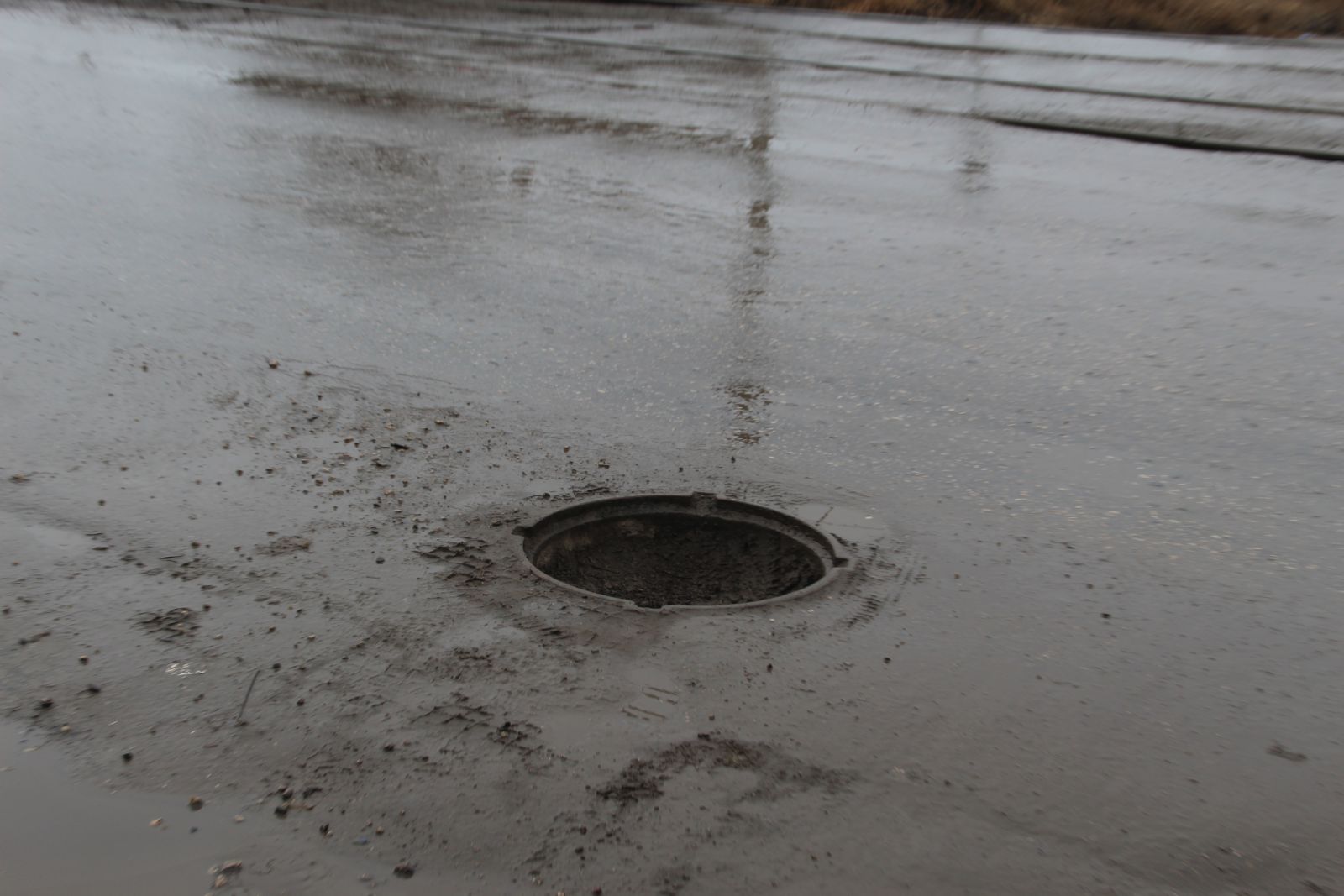 Внесли свою лепту и коммунальные службы, оставив у дома №111 по улице Огородной открытый люк и не восстановив покрытие на месте вскрышных работ, где щебень уже перемешался с грунтом, превратившись в желеподобное месиво.