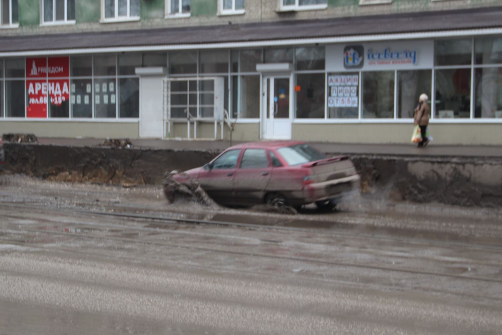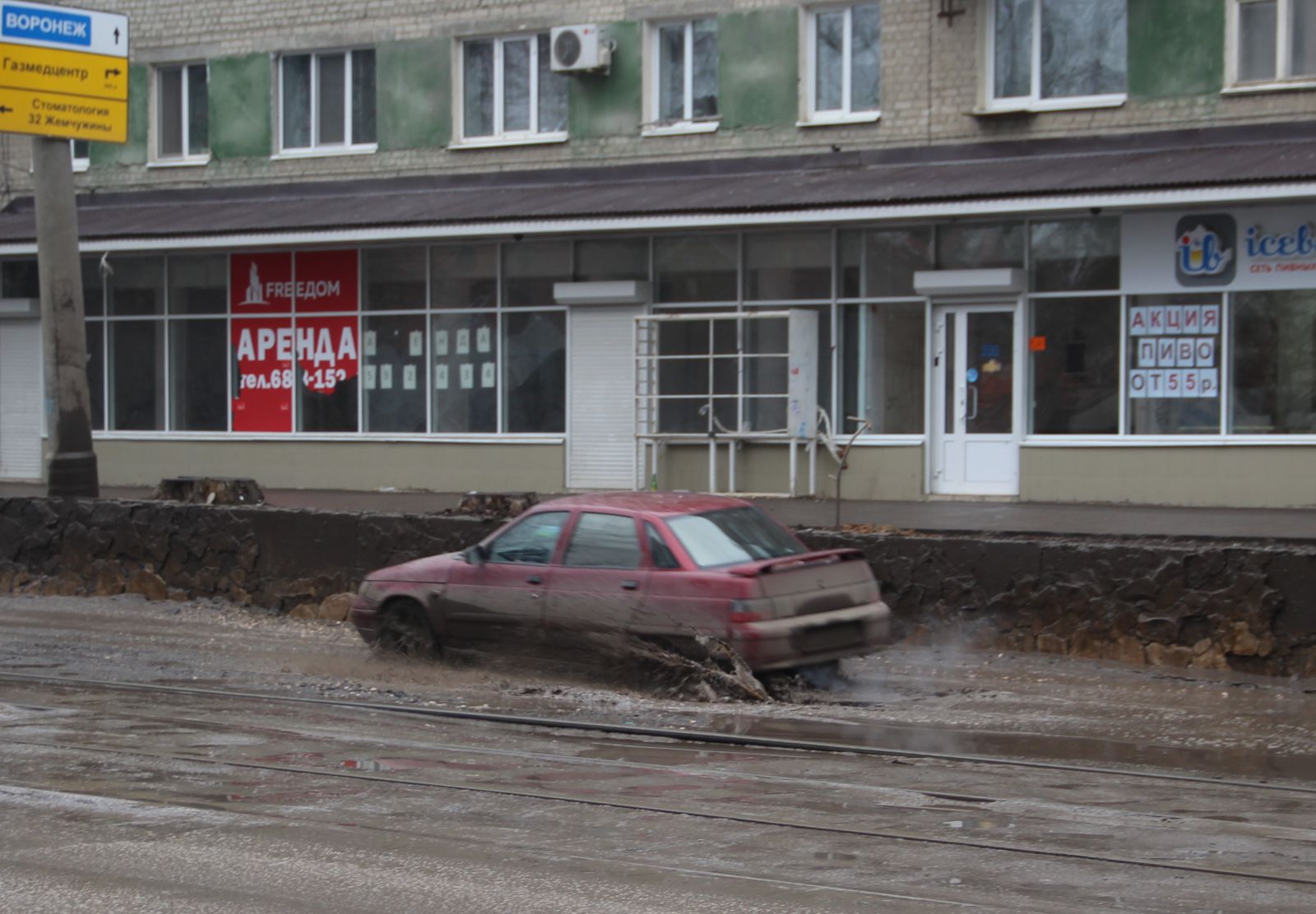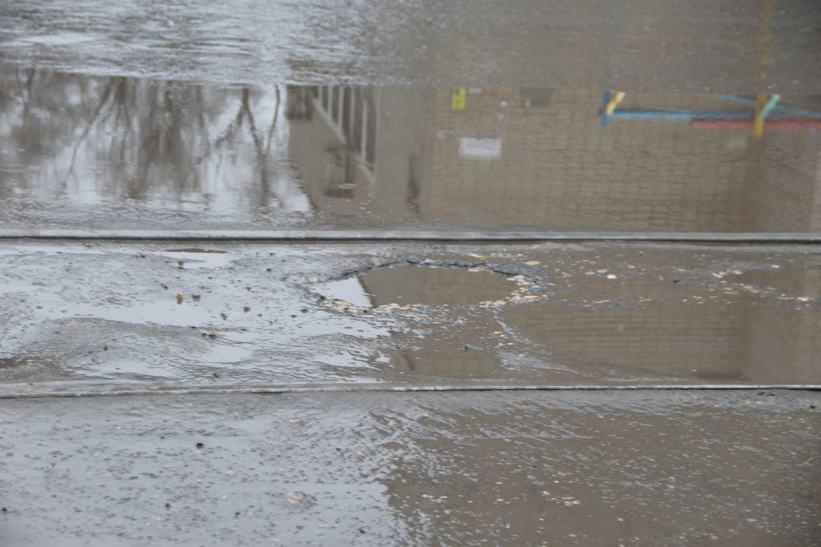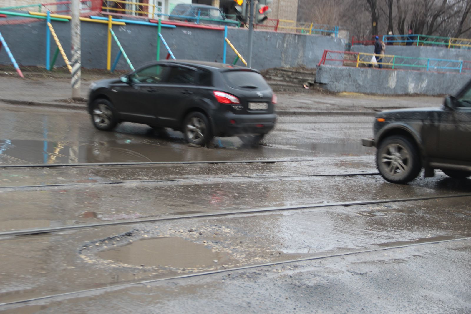 Две таких скрытых водой выбоины, в которых помещается колесо автомобиля расположились по соседству. Одна - у дома №151: