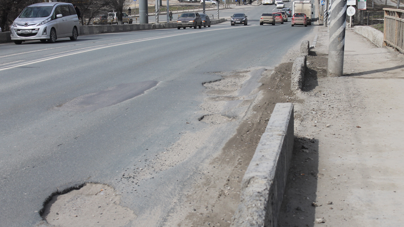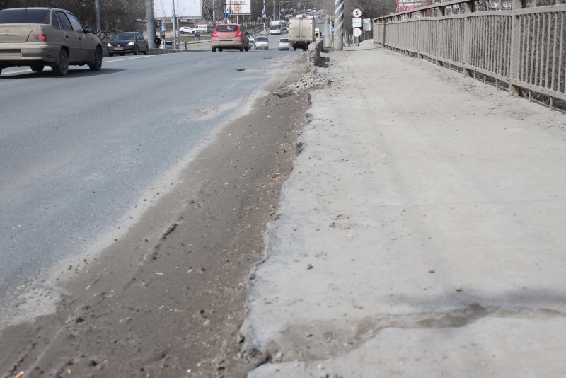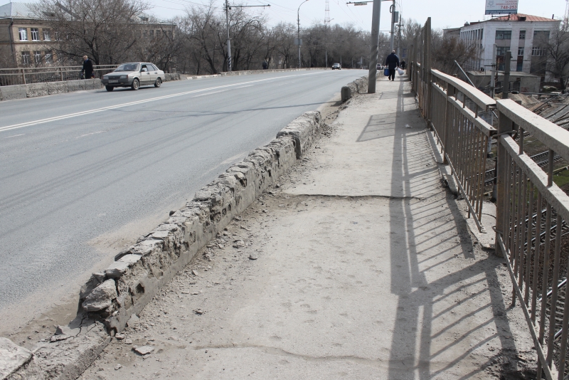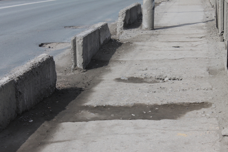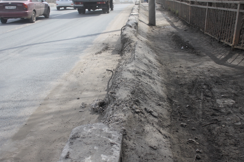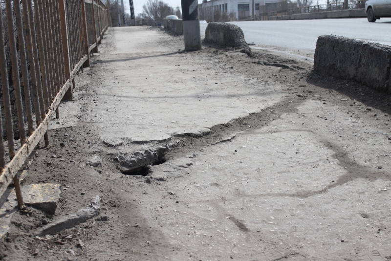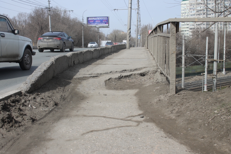 Небезопасен мост и для пешеходов, решивших воспользоваться этим маршрутом. Наиболее труден для них путь по правой стороне путепровода, если идти в направлении Ленинского района. Полуметровый слой грязи на пешеходной части у подхода к мосту – это не слишком сложное препятствие. Кое-где все же немного проглядывается асфальтное основание. Но на самом инженерном сооружении нужно еще преодолеть провалившуюся плиту, через которую перебраться с коляской уже невозможно. Многочисленные ямы в покрытии, сквозь которые проступает арматура, могут свидетельствовать об активном разрушении моста. Насколько сильно пострадали от отсутствия должного внимания несущие конструкции, можно только догадываться.