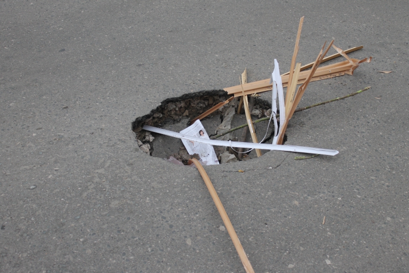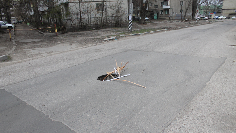Асфальт обвалился на одном из участков с недавно восстановленным твердым покрытием. Глубокую яму, ставшую ловушкой для невнимательных водителей, местные жители попытались обозначить подручными средствами из палок и пластика.