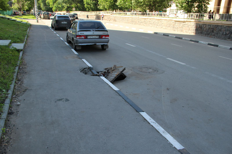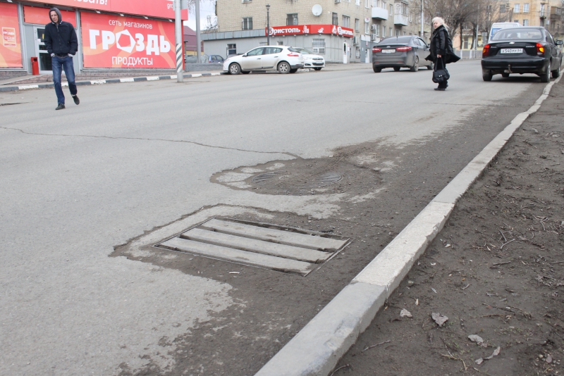 Просевший в 2016 году дождеприемник на улице Аткарской, рядом с 3-м роддомом, за прошедшее время провалился. Глубокая яма плохо различима и ничем не обозначена. Из-за этого автомобили, в том числе и общественный транспорт, движущиеся в сторону улицы Рабочей, могут угодить в нее колесом, повредив подвеску.