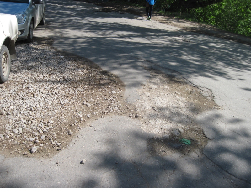 Но все же на этом участке Заводской дорожники пытаются устранять наиболее глубокие выбоины ямочным ремонтом. Чего не скажешь о другом спуске, начинающемся от остановки общественного транспорта. В некоторых местах дорожное покрытие разрушено полностью, превратившись в смесь кусков асфальта и щебня. Глубокие выбоины значительно затрудняют движение автотранспорта и пешеходов, вынужденных идти по проезжей части из-за отсутствующих тротуаров.