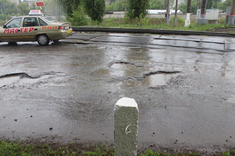В Заводском районе Саратова дорожное покрытие железнодорожных переездов по улице Пензенской и Ново-Астраханскому шоссе с зимы пребывает в ненормативном состоянии.