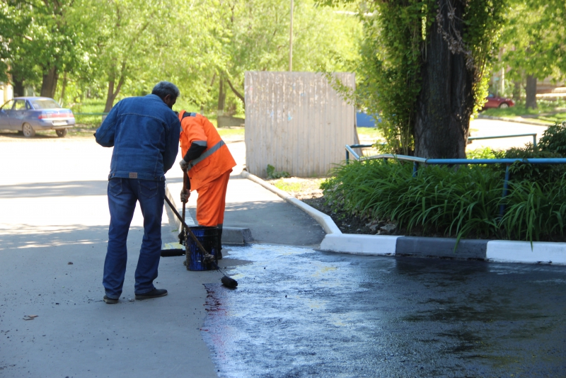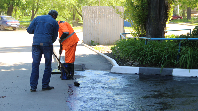 Рабочие предварительно очищают поверхность от пыли, после чего валиком наносят битум-полимерный модификатор. Единственным препятствием к быстрому окончанию работ стали припаркованные автомобили местных жителей. Жильцы, выходящие из подъезда, недоуменно вопрошали, «можно ли идти по свежепокрашенной дороге».