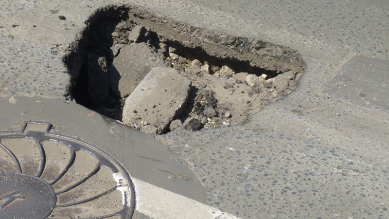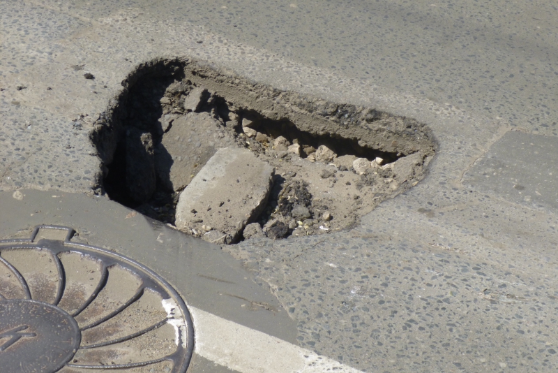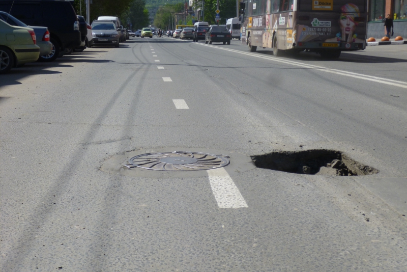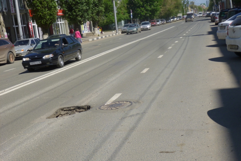 Провал захватывает левую полосу движения в сторону центра, не доезжая улицы Пугачёва. Препятствие не огорожено, что может принести автолюбителям немало хлопот.