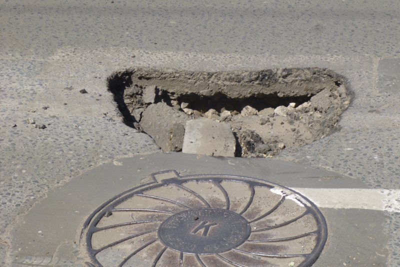 Провал расположен в непосредственной близости от смотрового колодца, что говорит об ответственности коммунальщиков за своевременное приведение дороги в нормативное состояние.