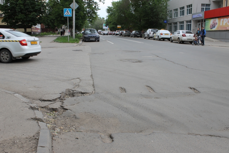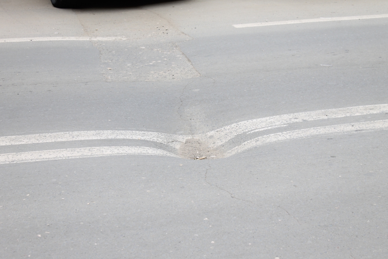Ещё одна глубокая просадка асфальта наблюдается посередине дороги, напротив дома №106. От образовавшейся ямы по дорожному покрытию пошли трещины, предвещая образование в этом месте провала.